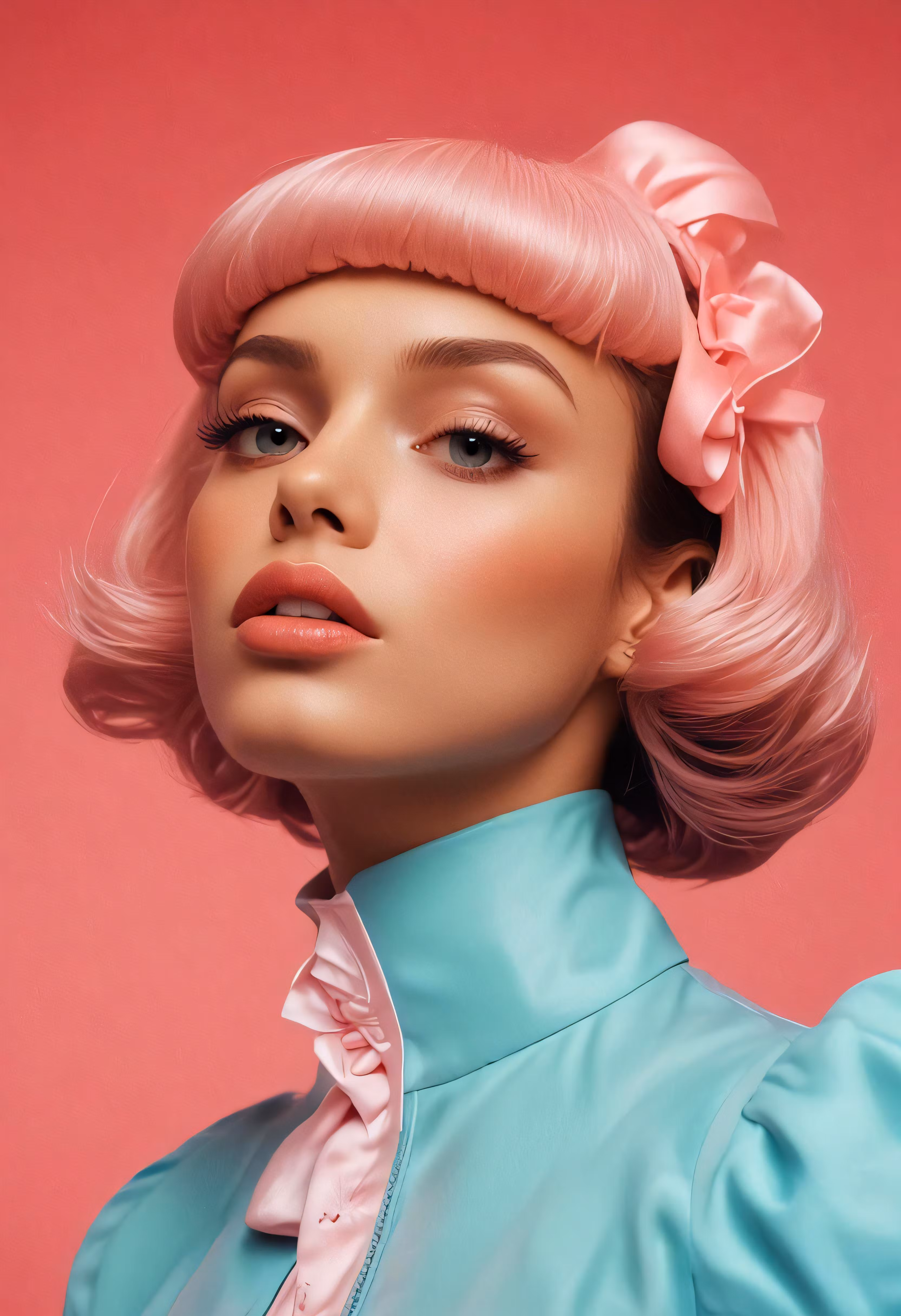 High resolution picture, free to use, a young lady is dressed in pastel blue and has a pink bow in her hair