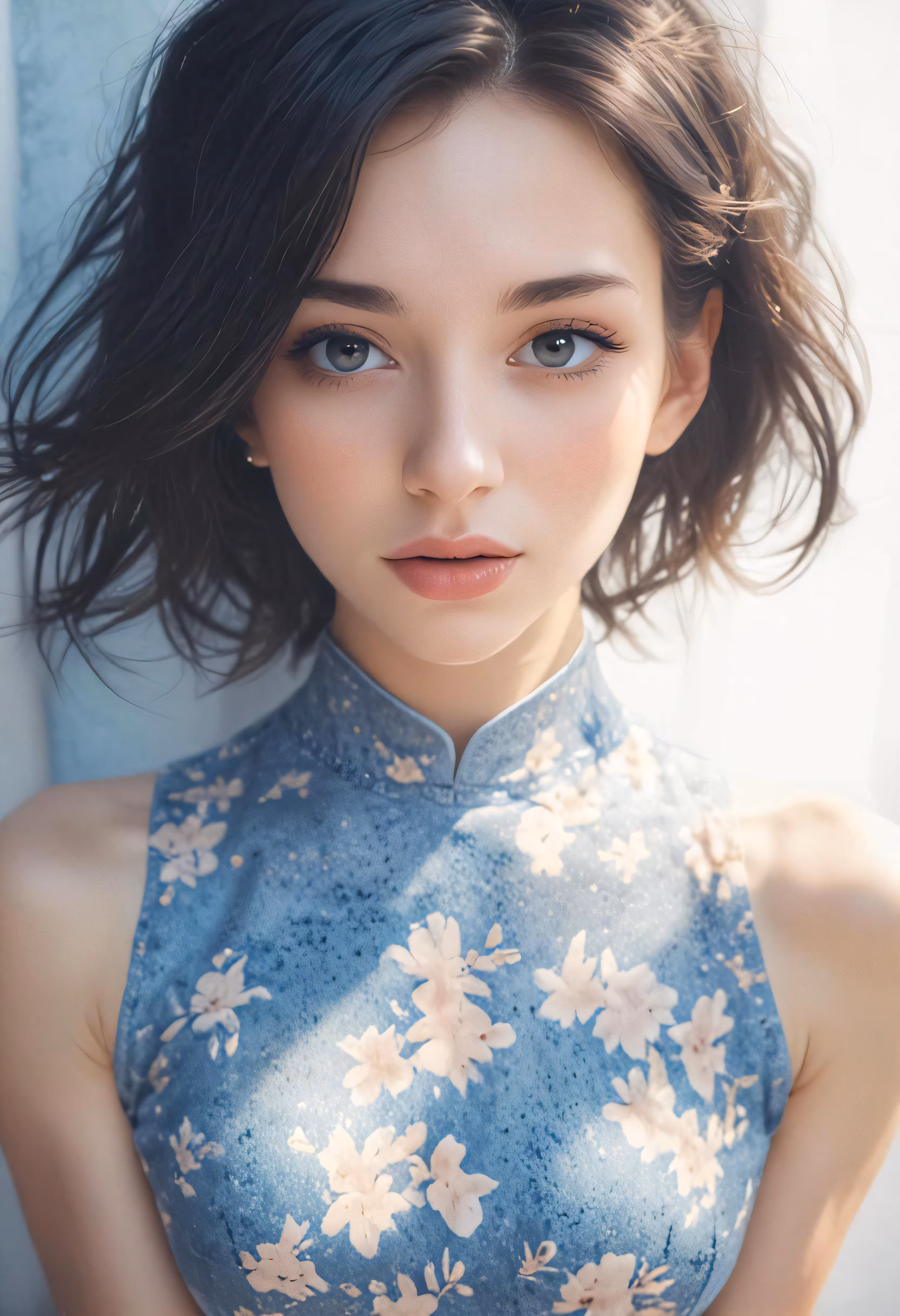 High resolution picture, free to use, a young lady wearing blue dress looking off to the side