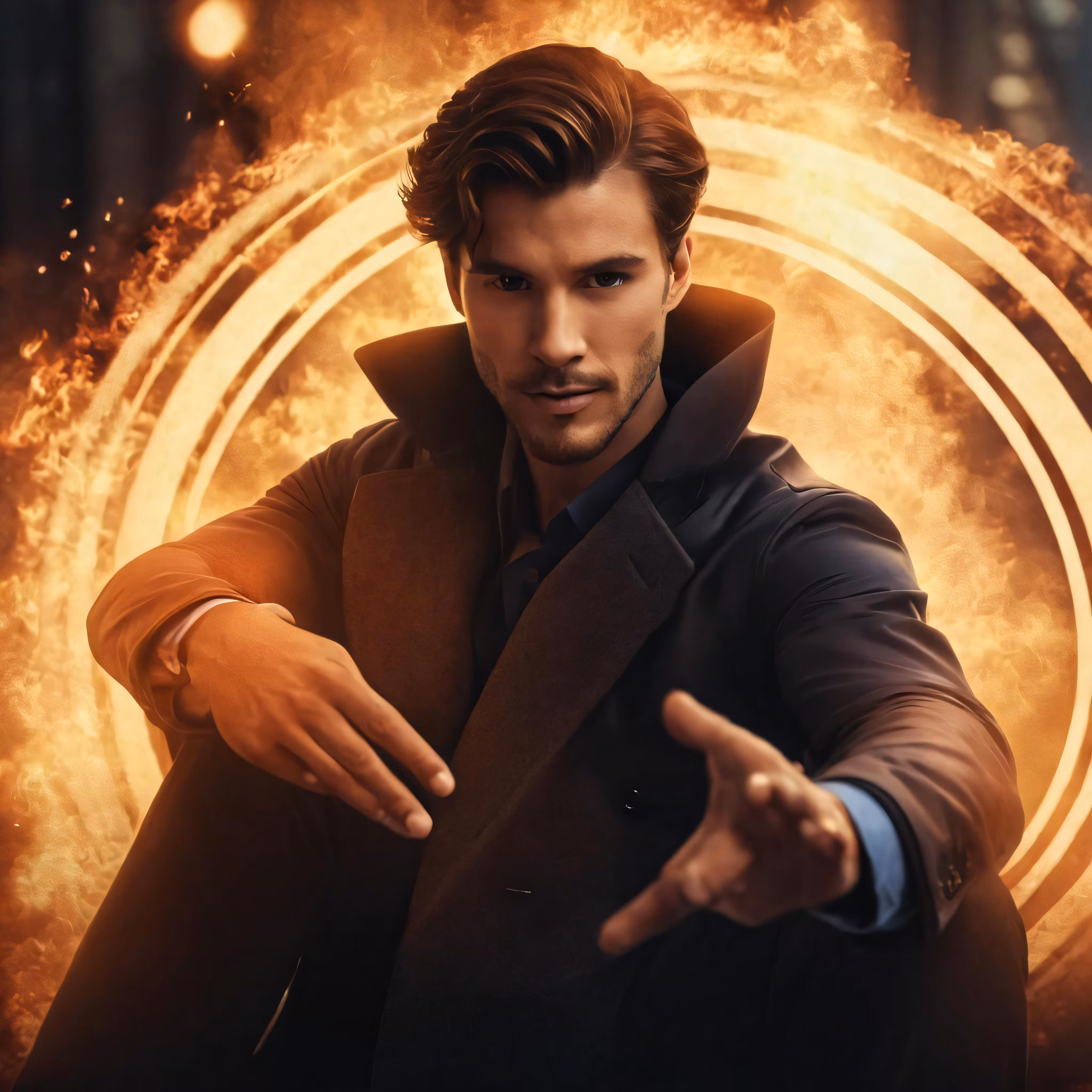 High resolution picture, free to use, a young man in a brown jacket is in front of a circular sign
