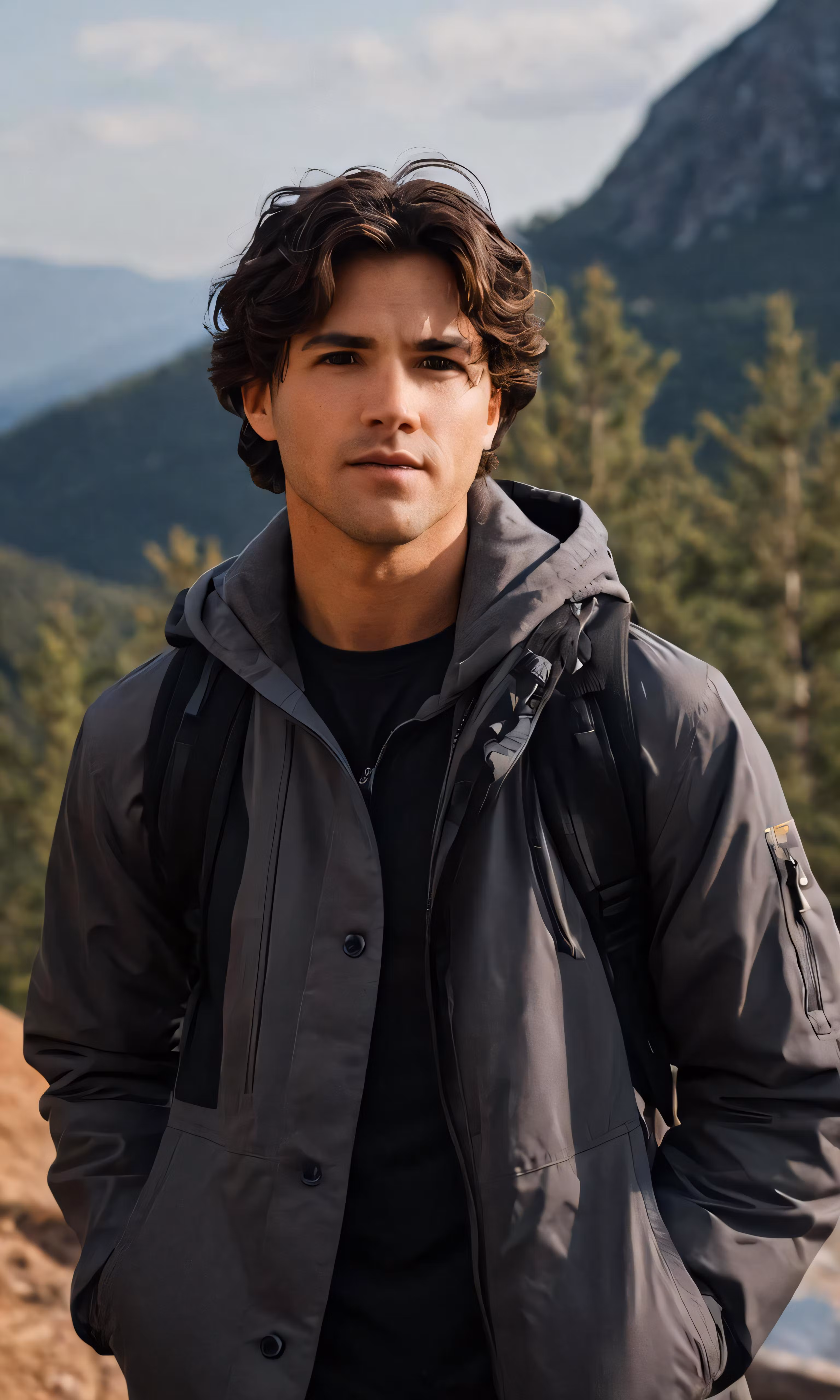 High resolution picture, free to use, a young man with curly hair standing on a cliff near the woods