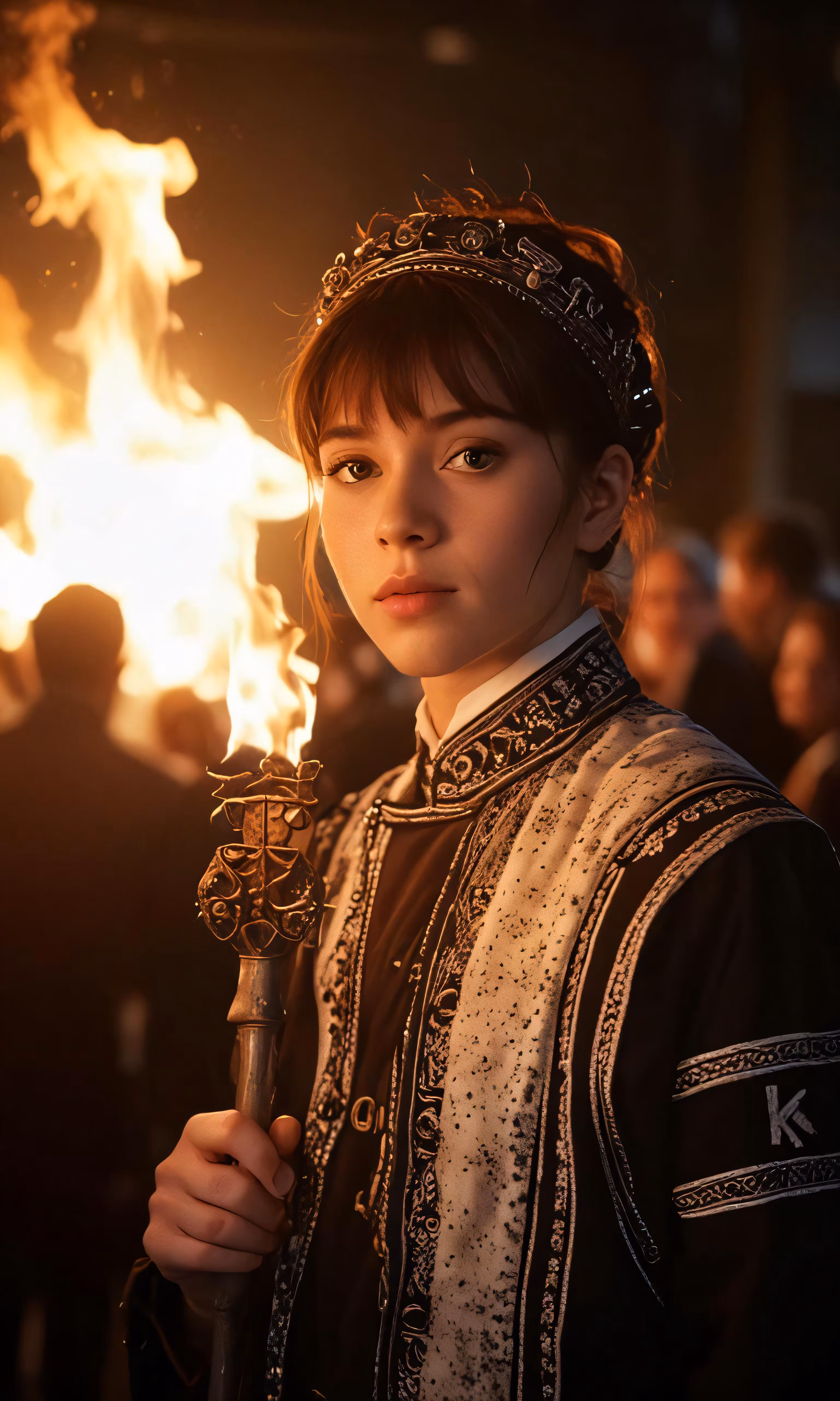 High resolution picture, free to use, a young person is holding a torch as people watch from the back