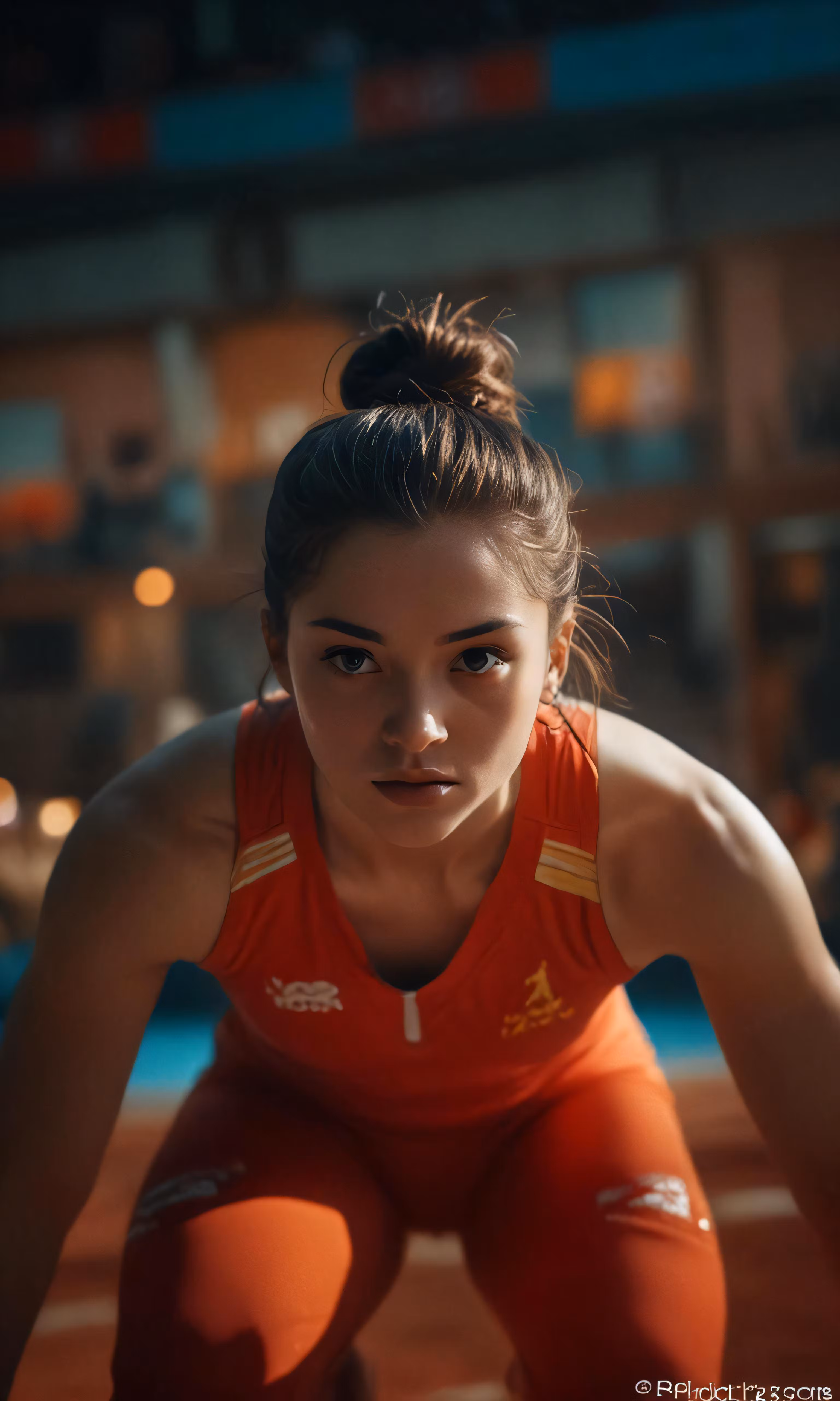 High resolution picture, free to use, a young woman crouches on a tennis court