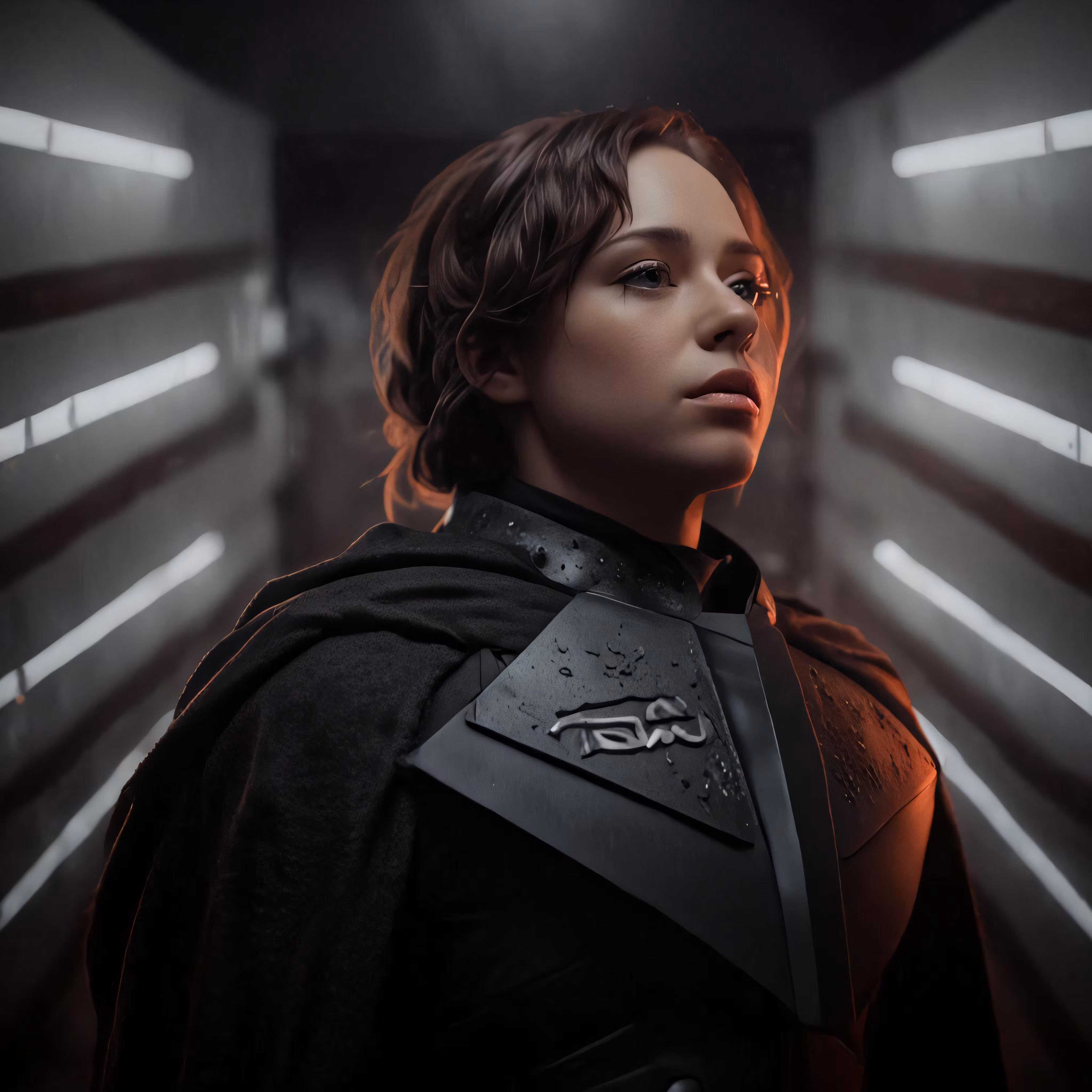 High resolution picture, free to use, a young woman dressed up as darth vader, in front of a light tunnel
