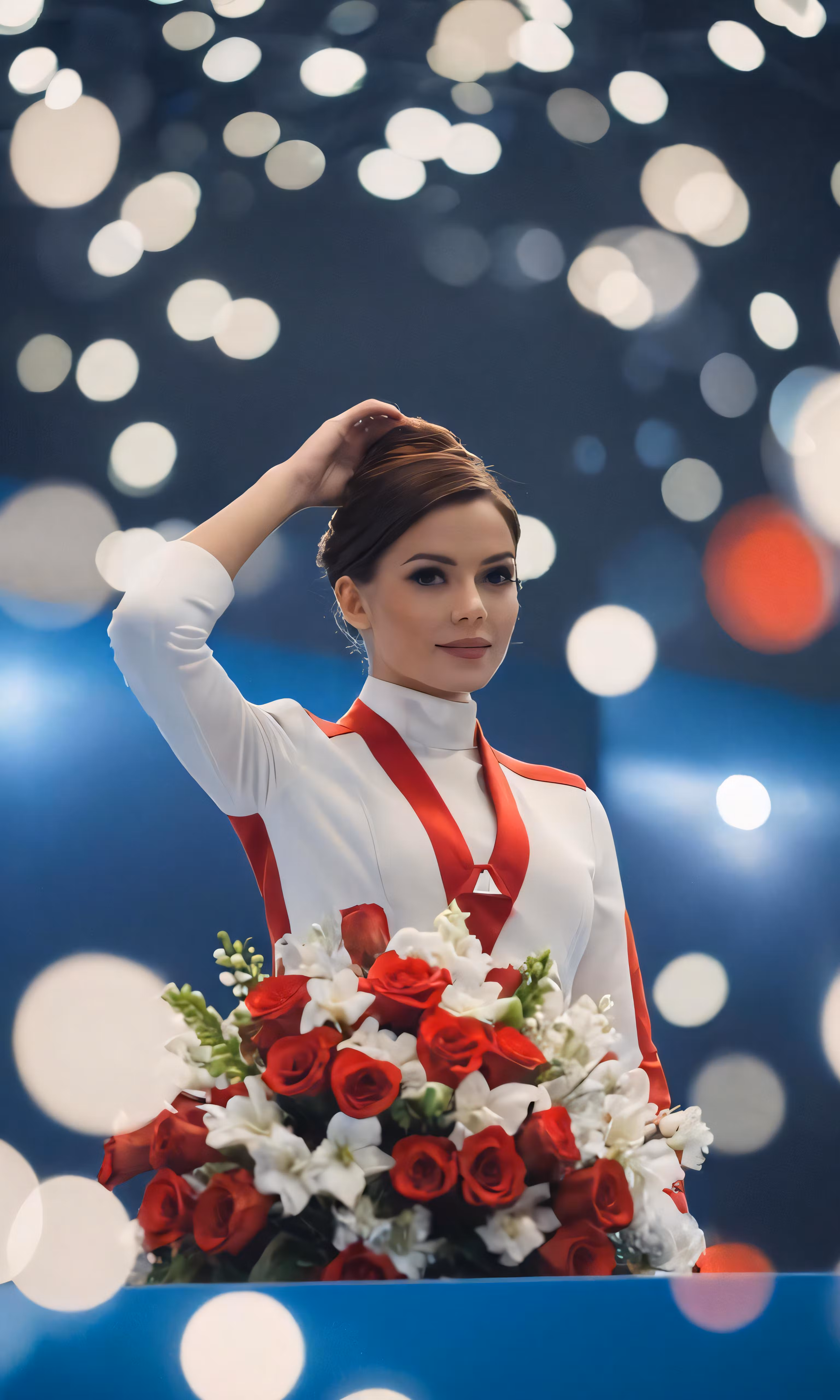 High resolution picture, free to use, a young woman holding a bouquet of flowers standing behind a stage