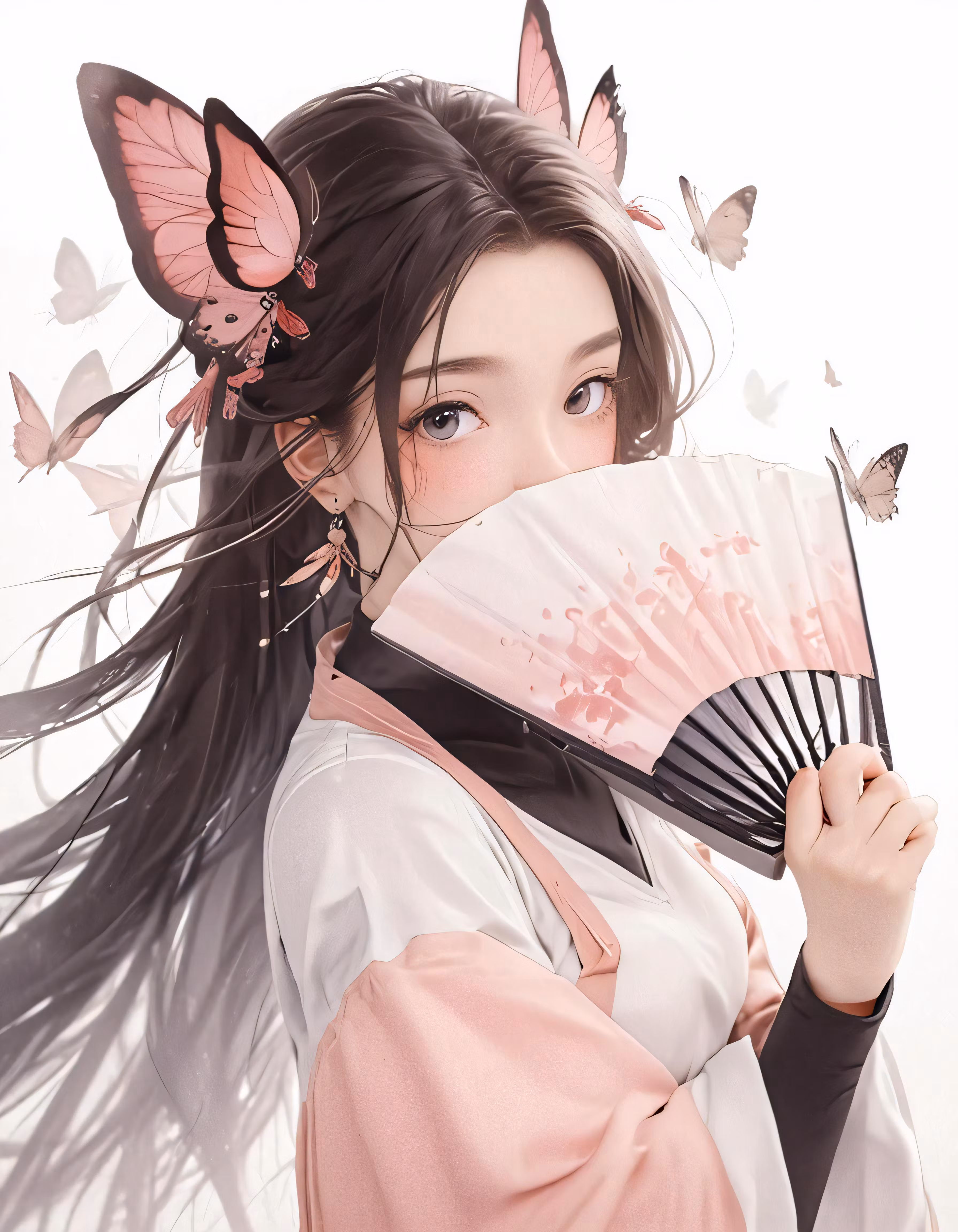 High resolution picture, free to use, a young woman holding a pink and black fan