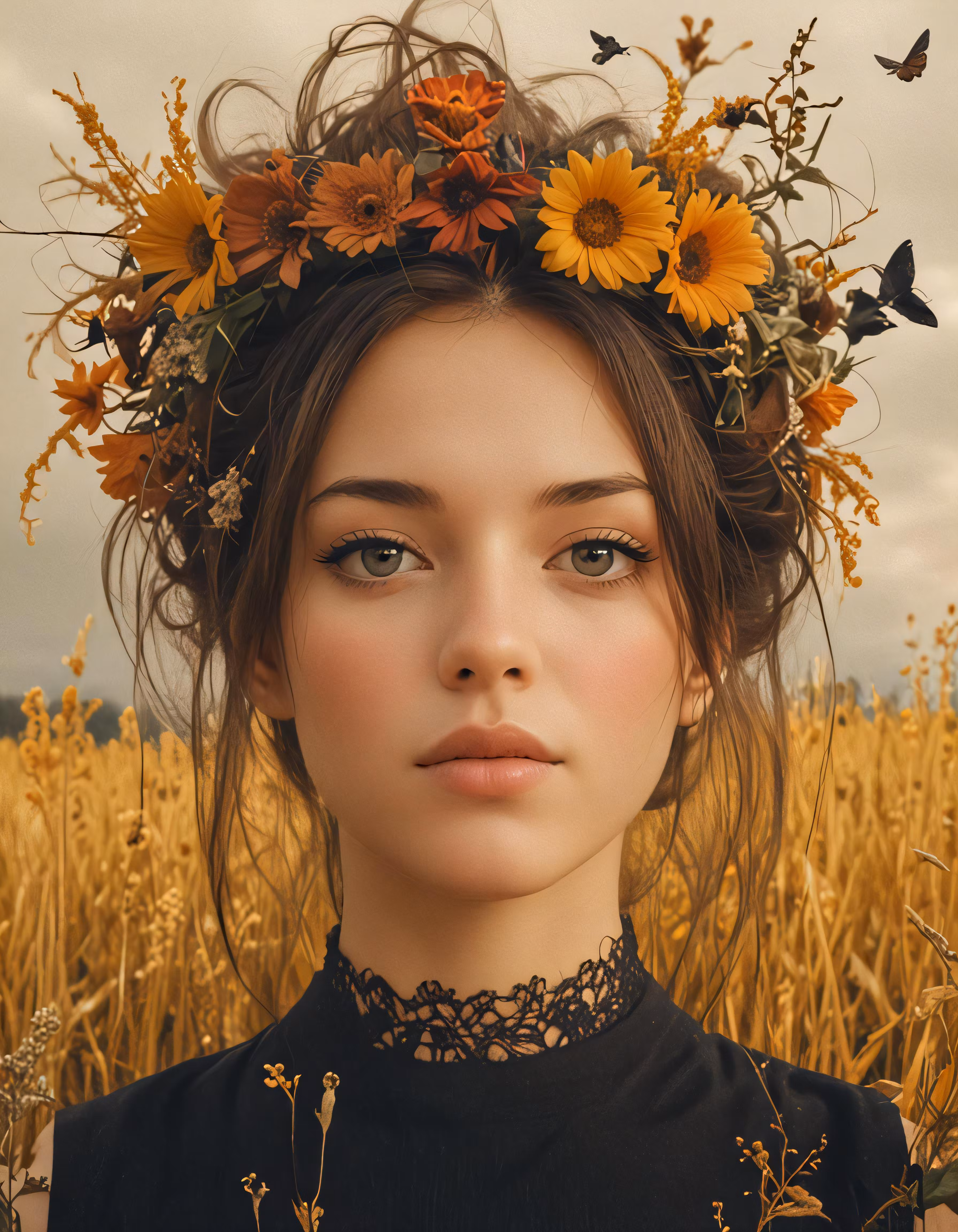 High resolution picture, free to use, a young woman in a field of yellow sunflowers with her hair in a crown