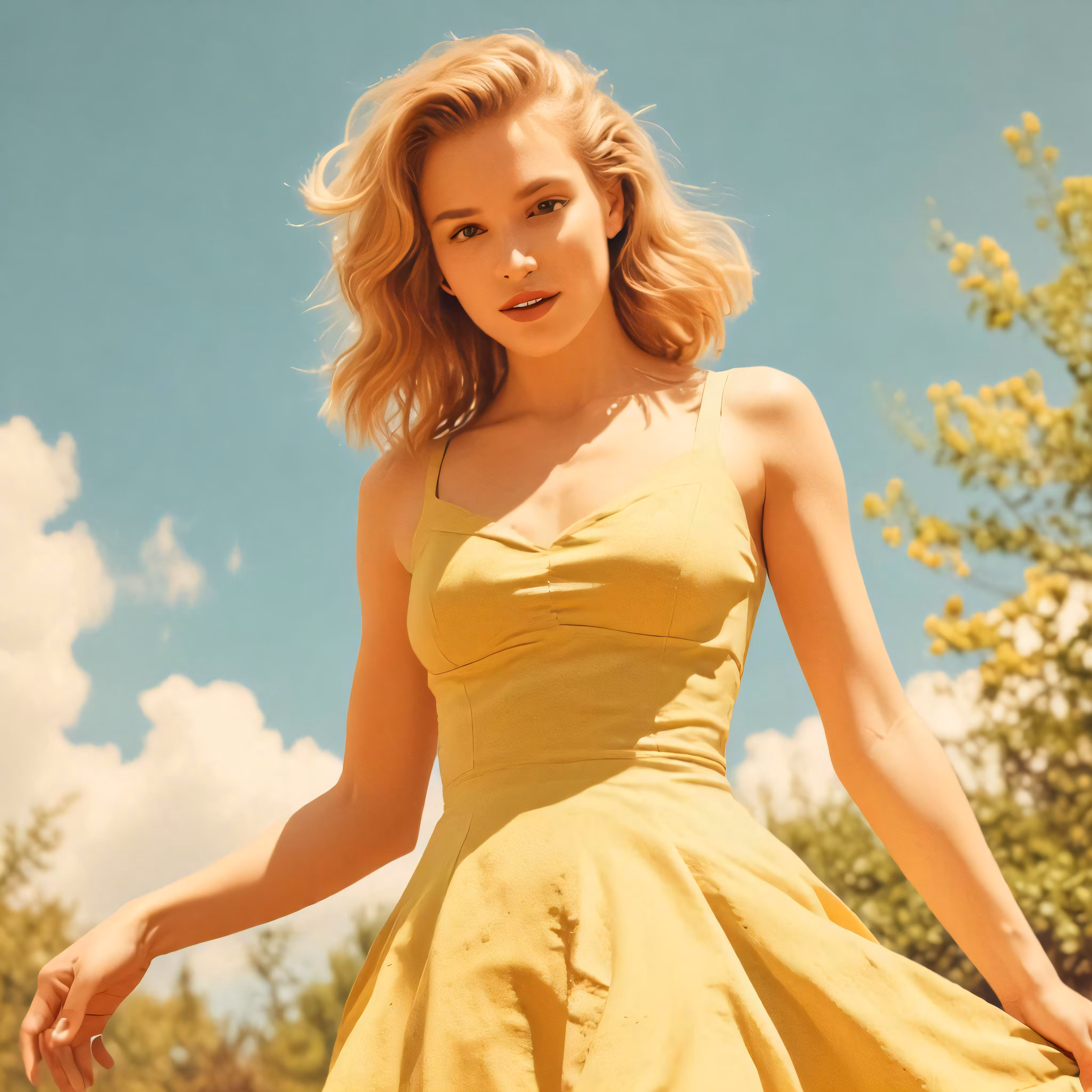 High resolution picture, free to use, a young woman in a yellow dress looking to her left