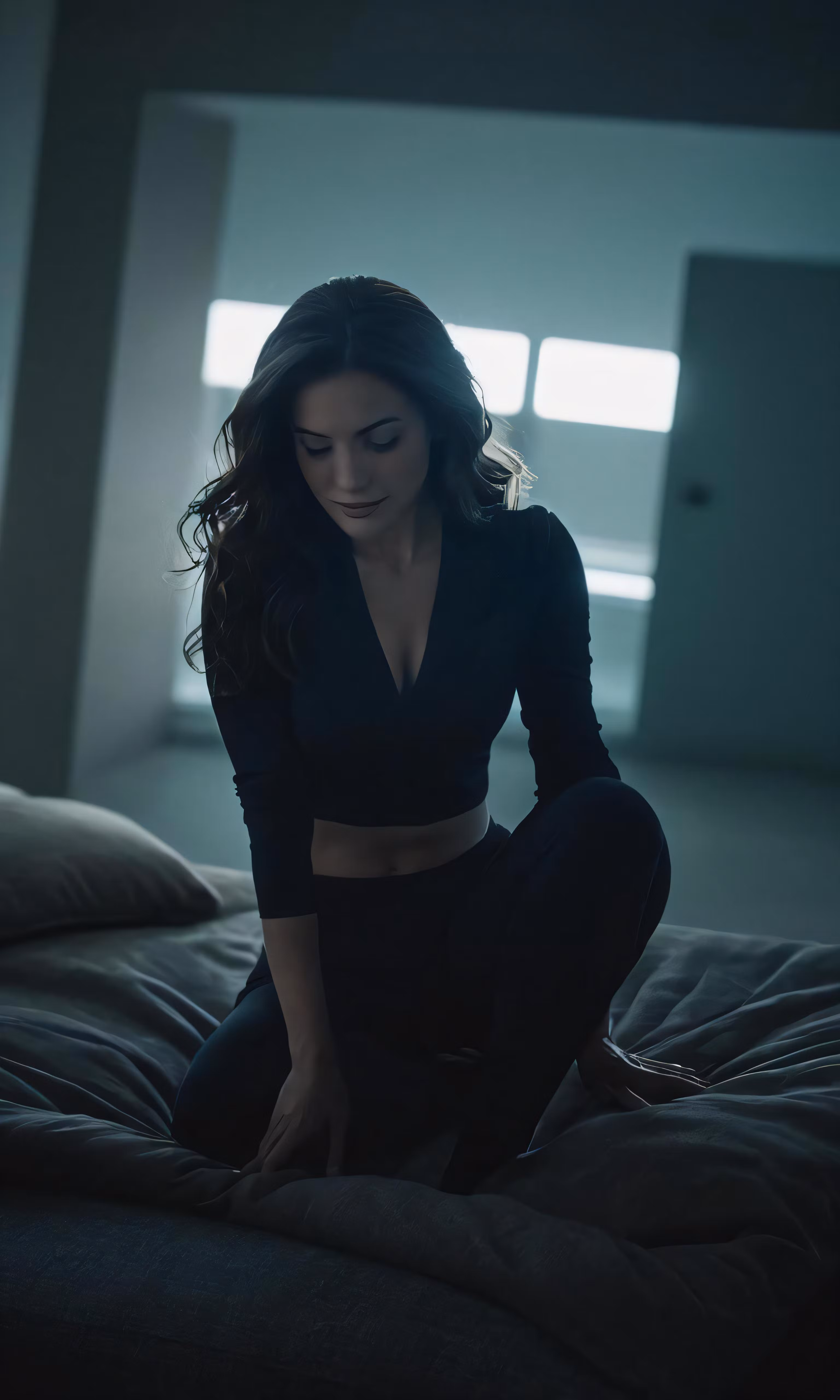 High resolution picture, free to use, a young woman in black dress kneeling on a bed