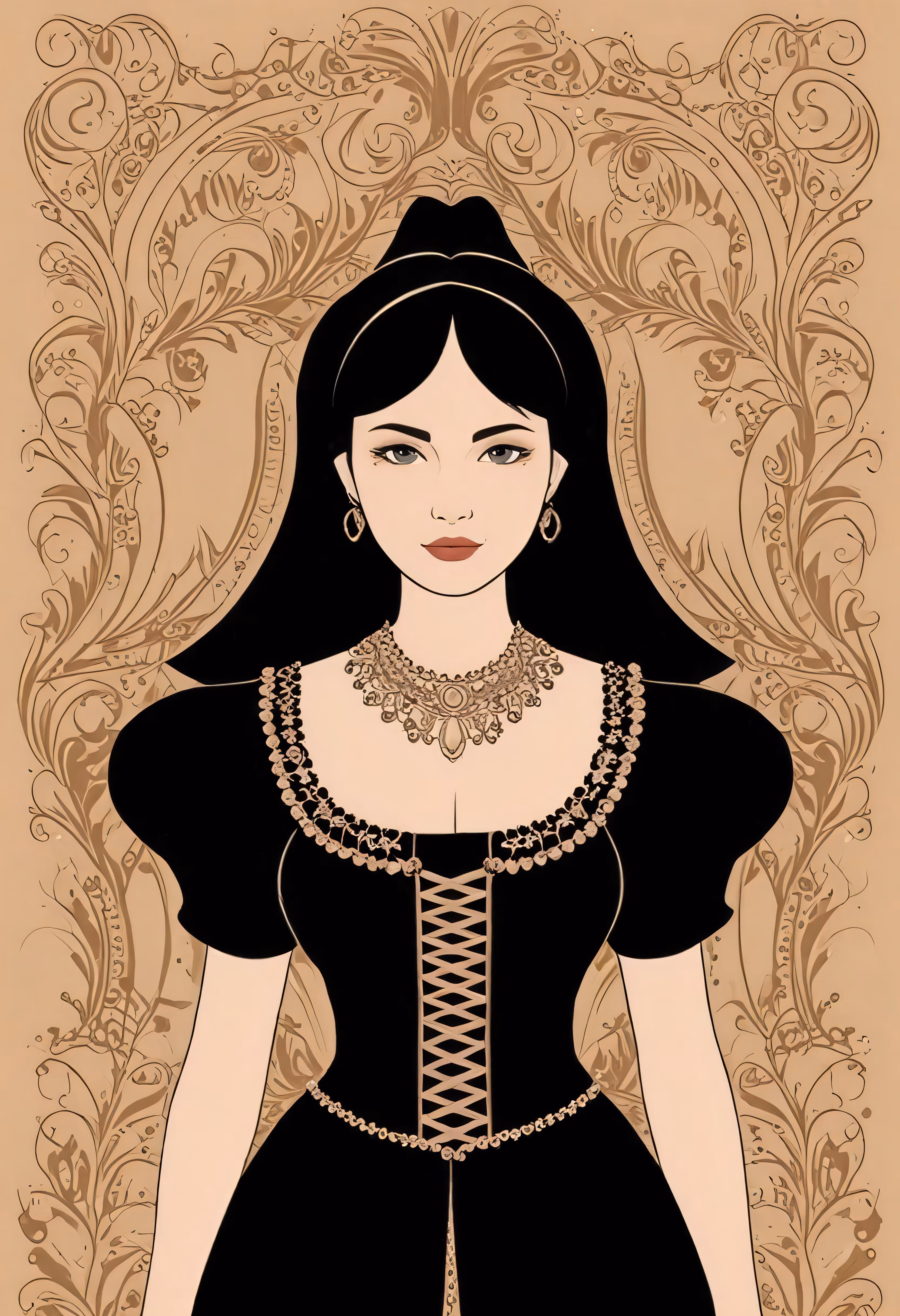 High resolution picture, free to use, a young woman in black is depicted against an intricate beige background