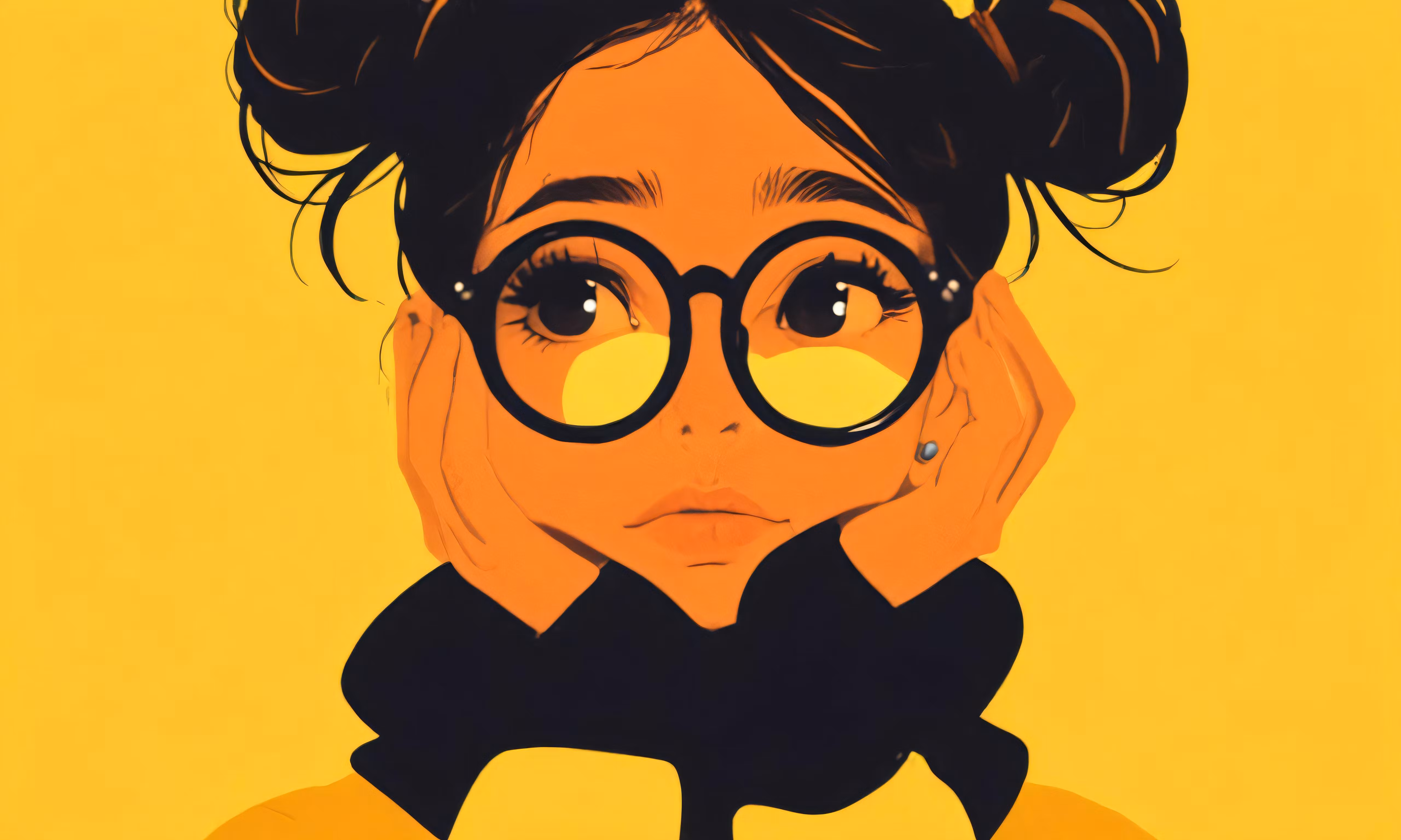 High resolution picture, free to use, a young woman in glasses is looking at her nose
