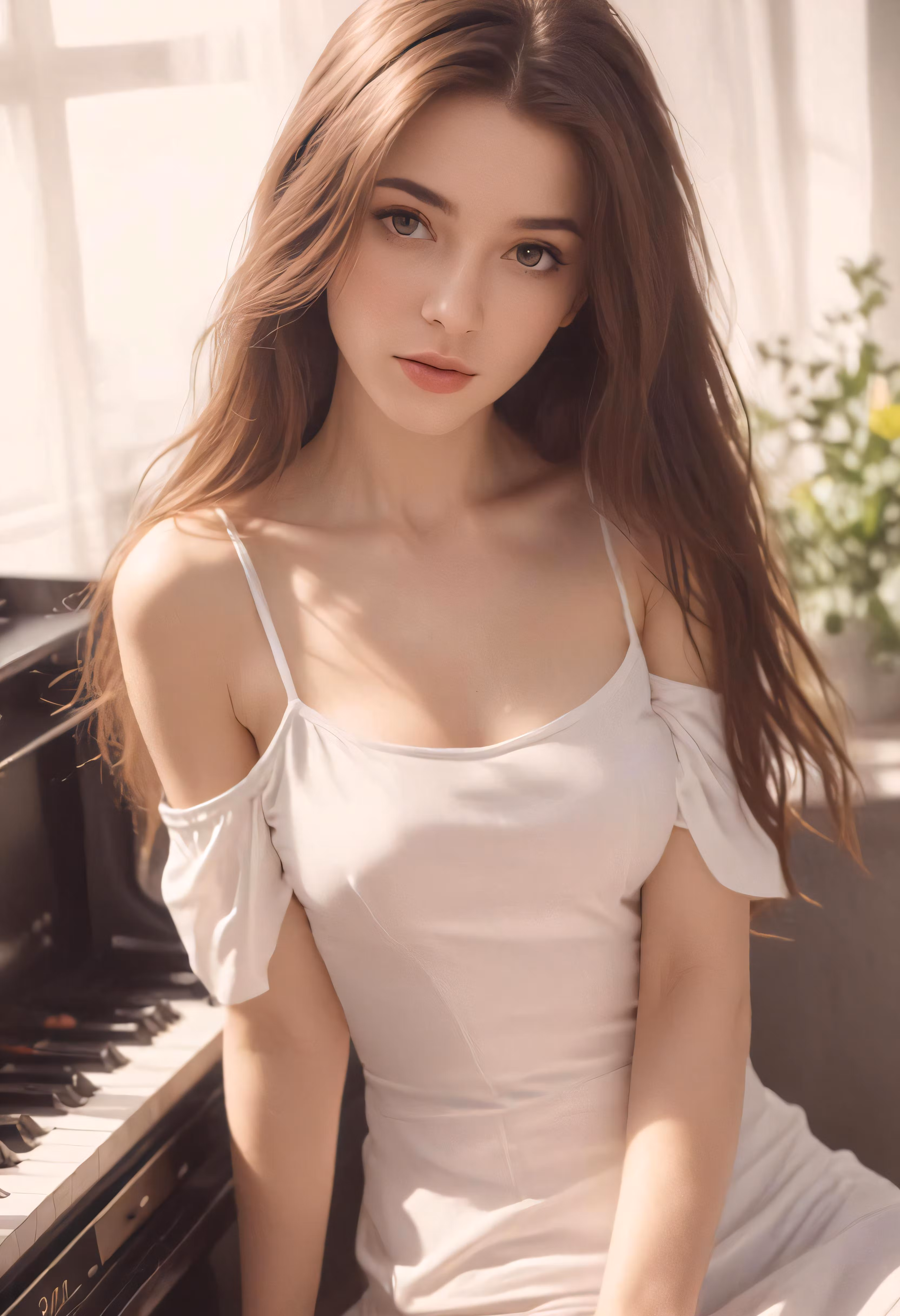 High resolution picture, free to use, a young woman in white dress sitting next to a piano