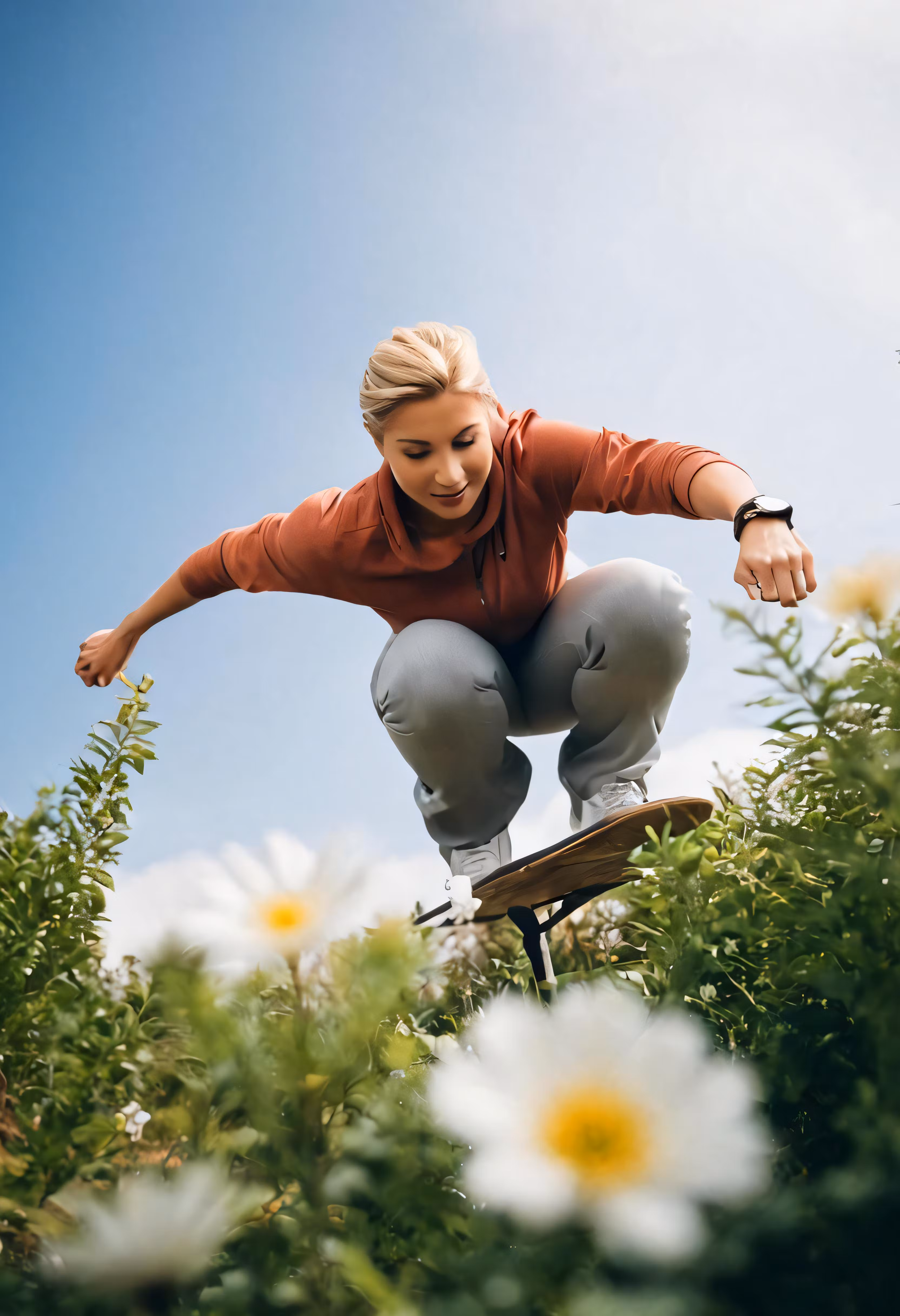 High resolution picture, free to use, a young woman is in the air on a skateboard