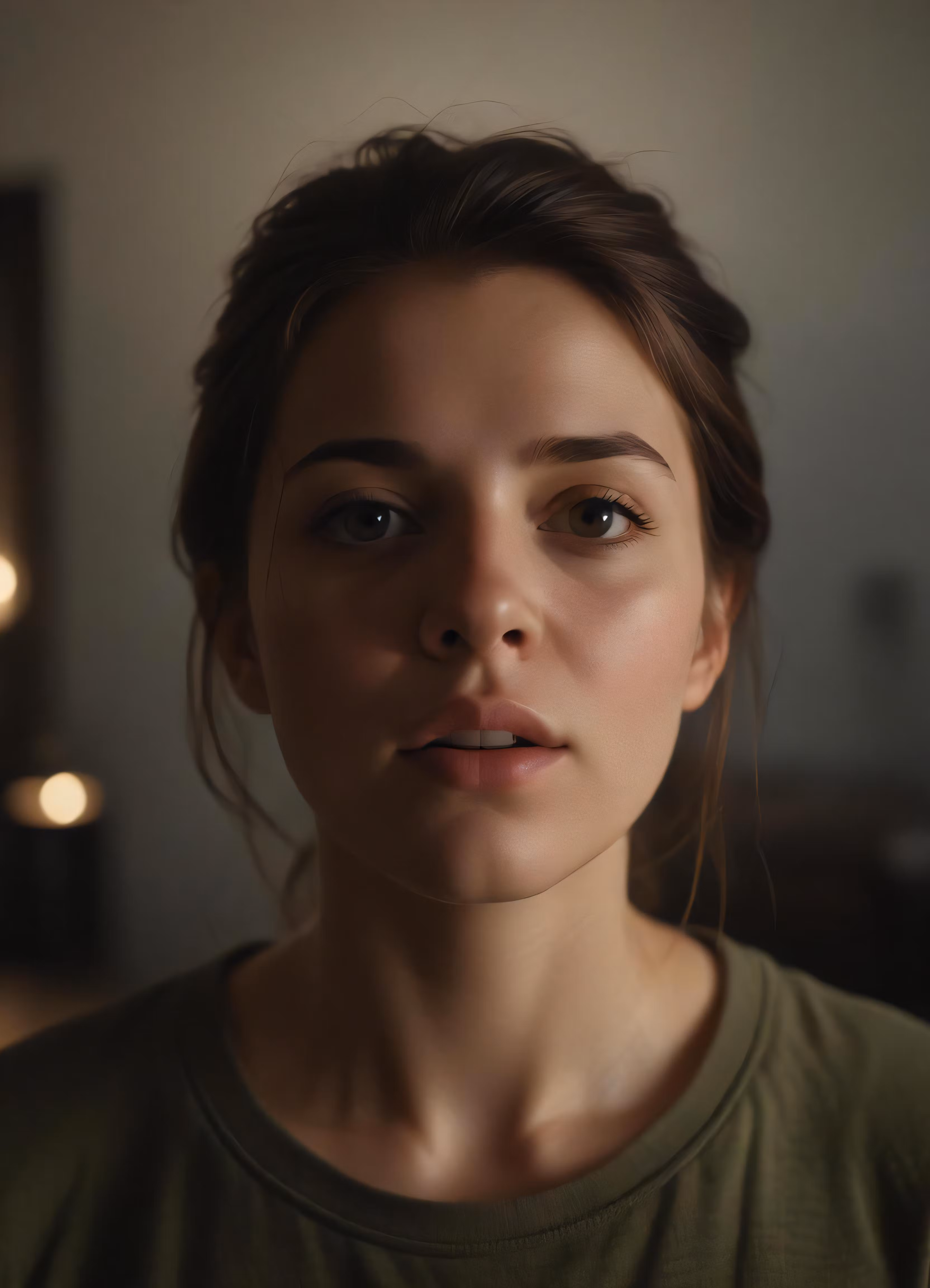 High resolution picture, free to use, a young woman looks at the camera with dim lighting behind her