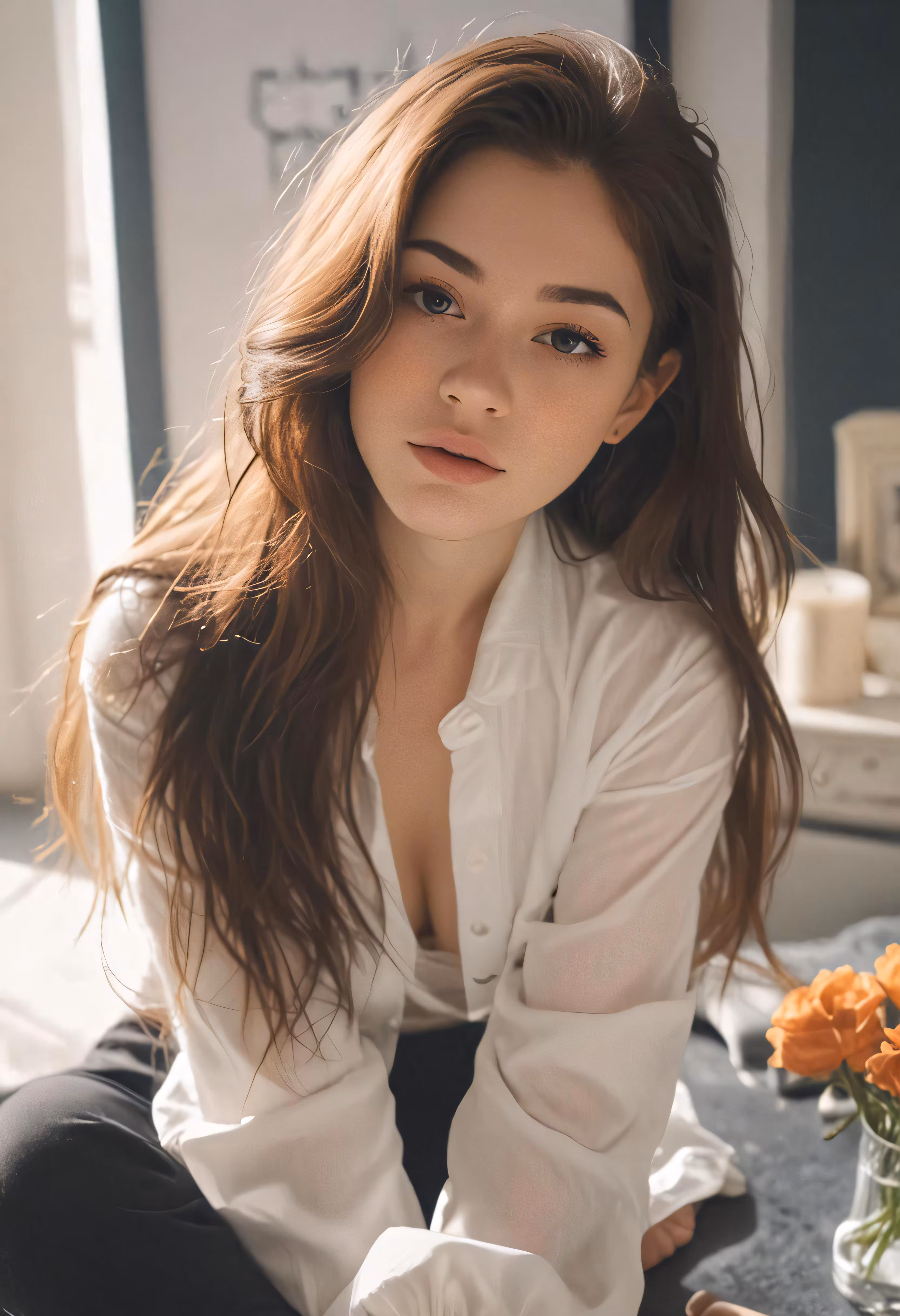 High resolution picture, free to use, a young woman sitting on a table with flowers