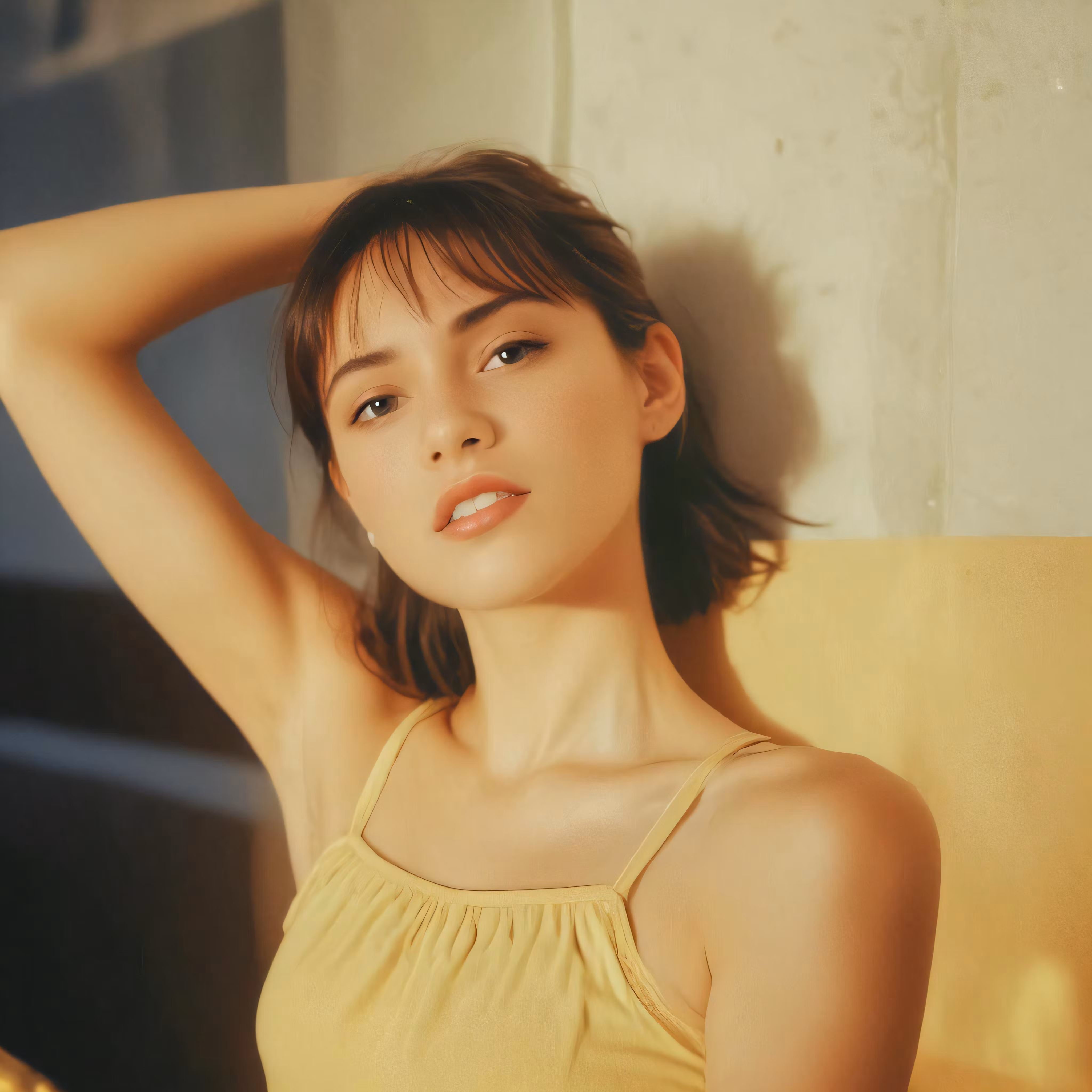 High resolution picture, free to use, a young woman sitting on a yellow couch wearing a tank top