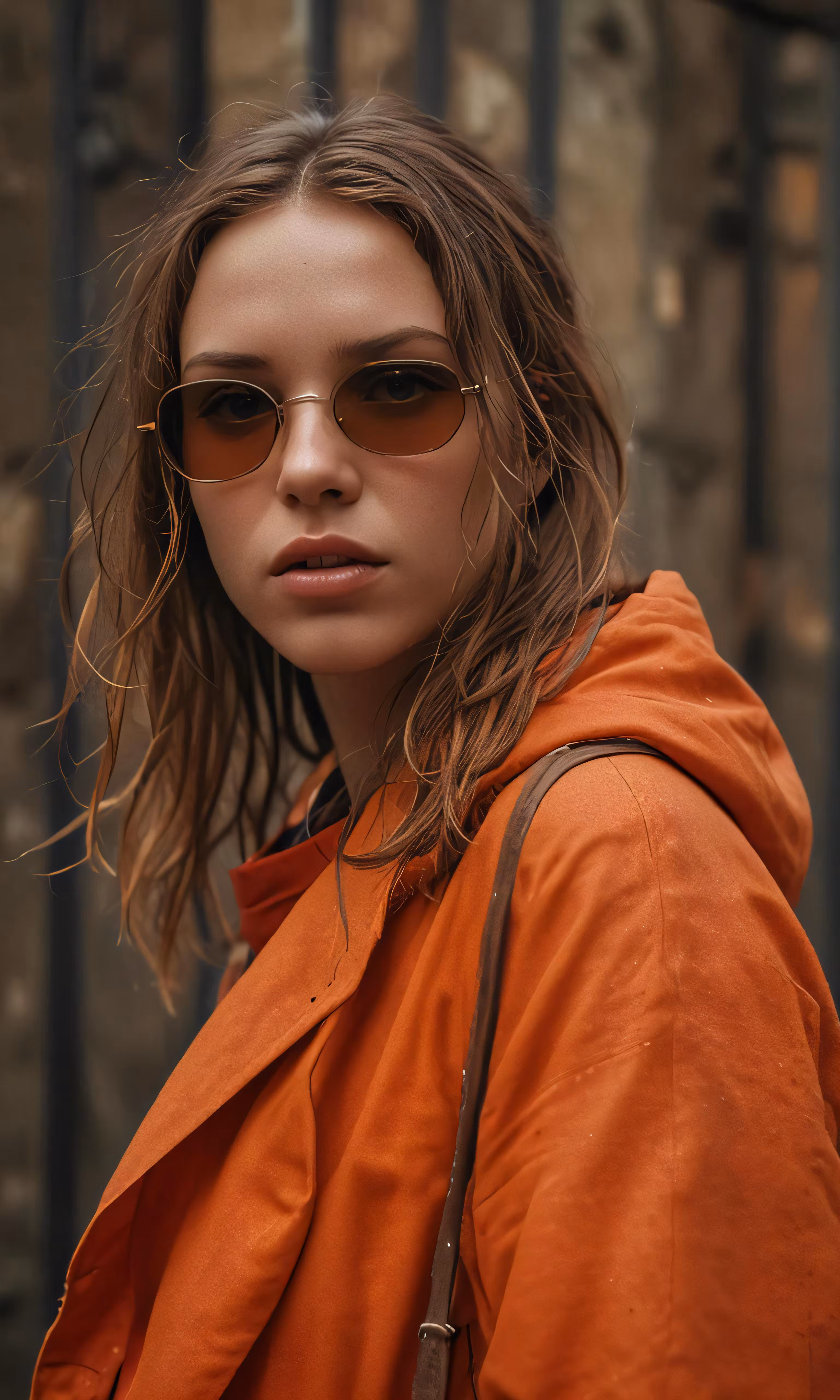 High resolution picture, free to use, a young woman wearing a orange jacket and brown sunglasses