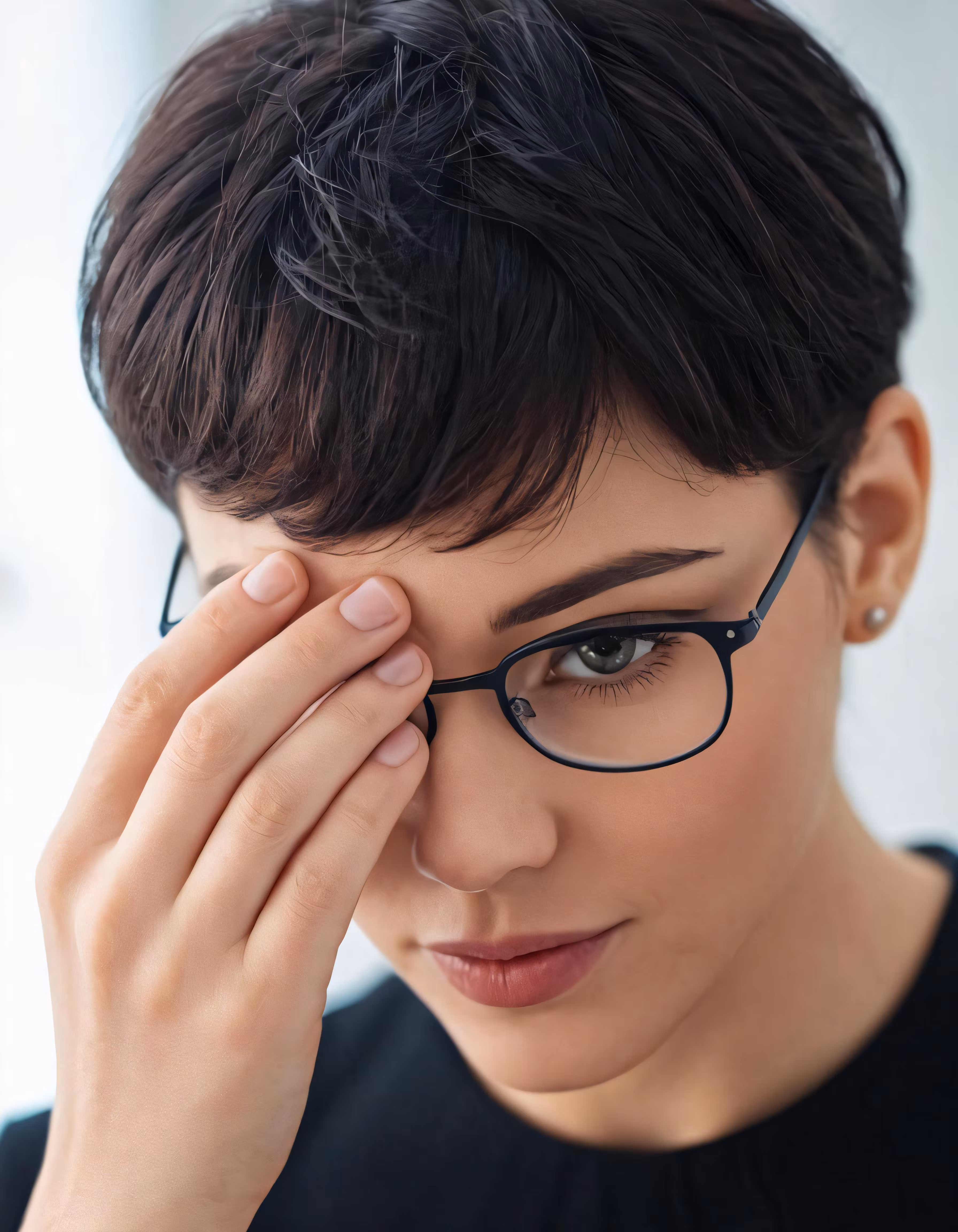 High resolution picture, free to use, a young woman wearing glasses with short hair looking off to her side