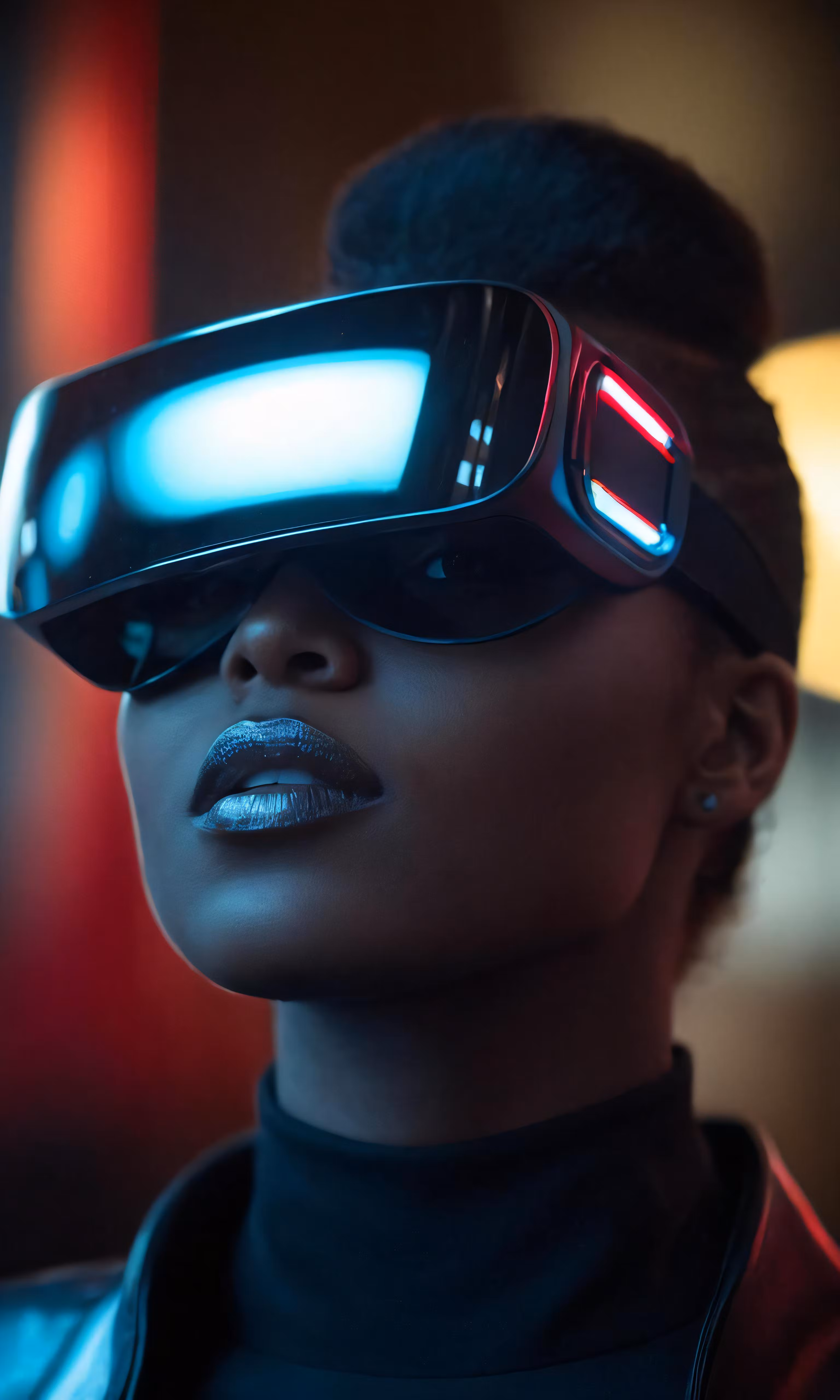 High resolution picture, free to use, a young woman wearing the same virtual reality helmet, as she looks into the distance