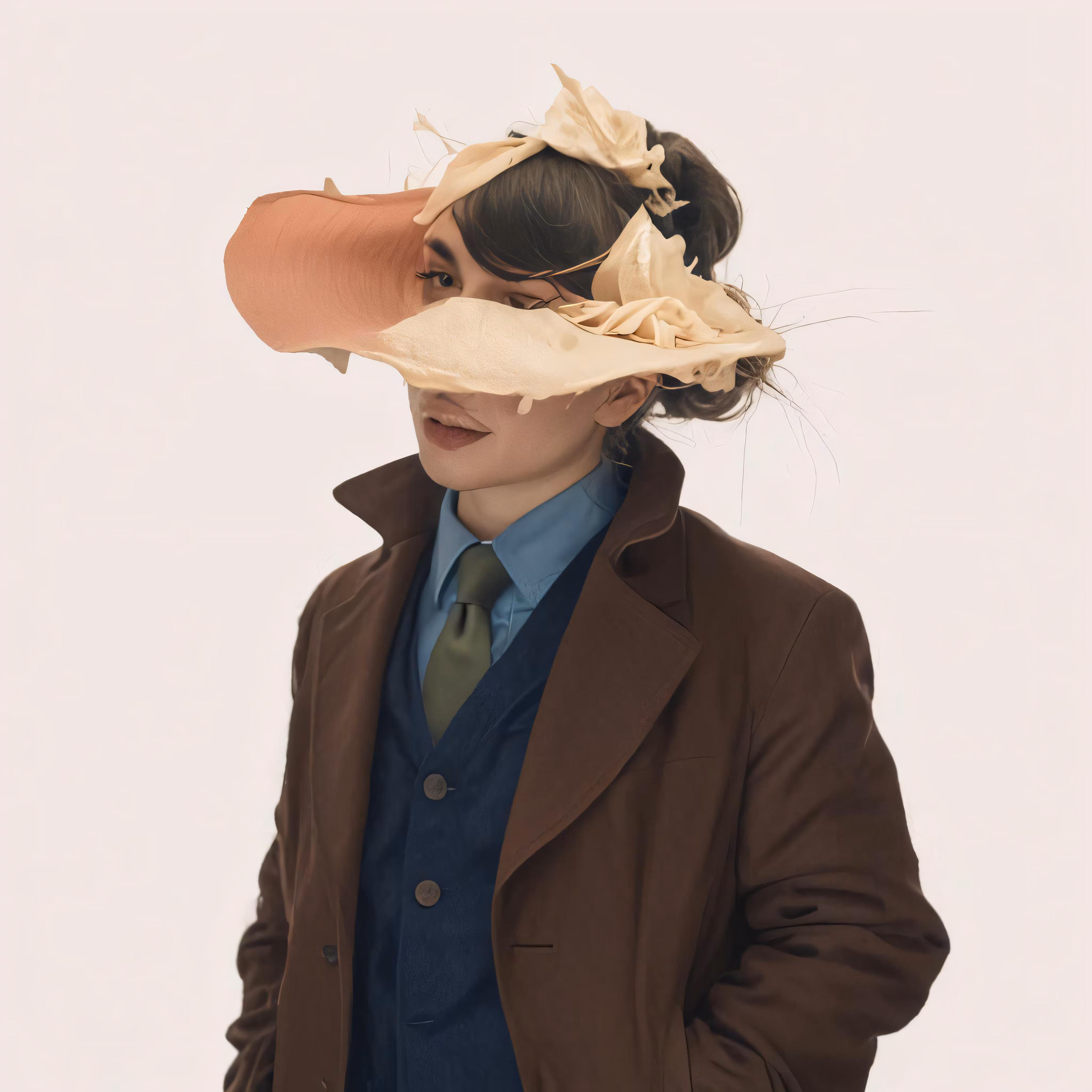 High resolution picture, free to use, a young woman with an unusual hat that looks like a feather