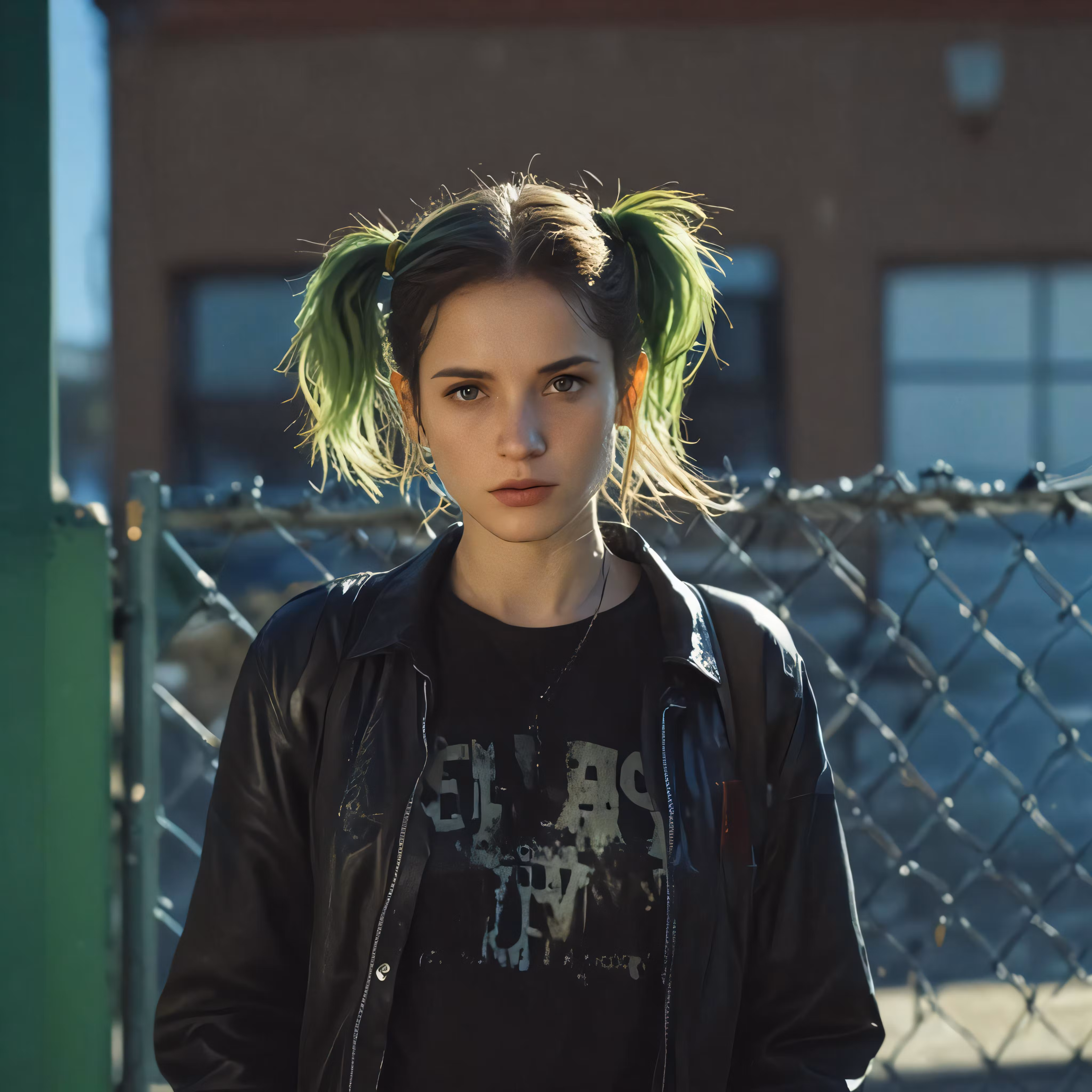 High resolution picture, free to use, a young woman with green hair and black shirt