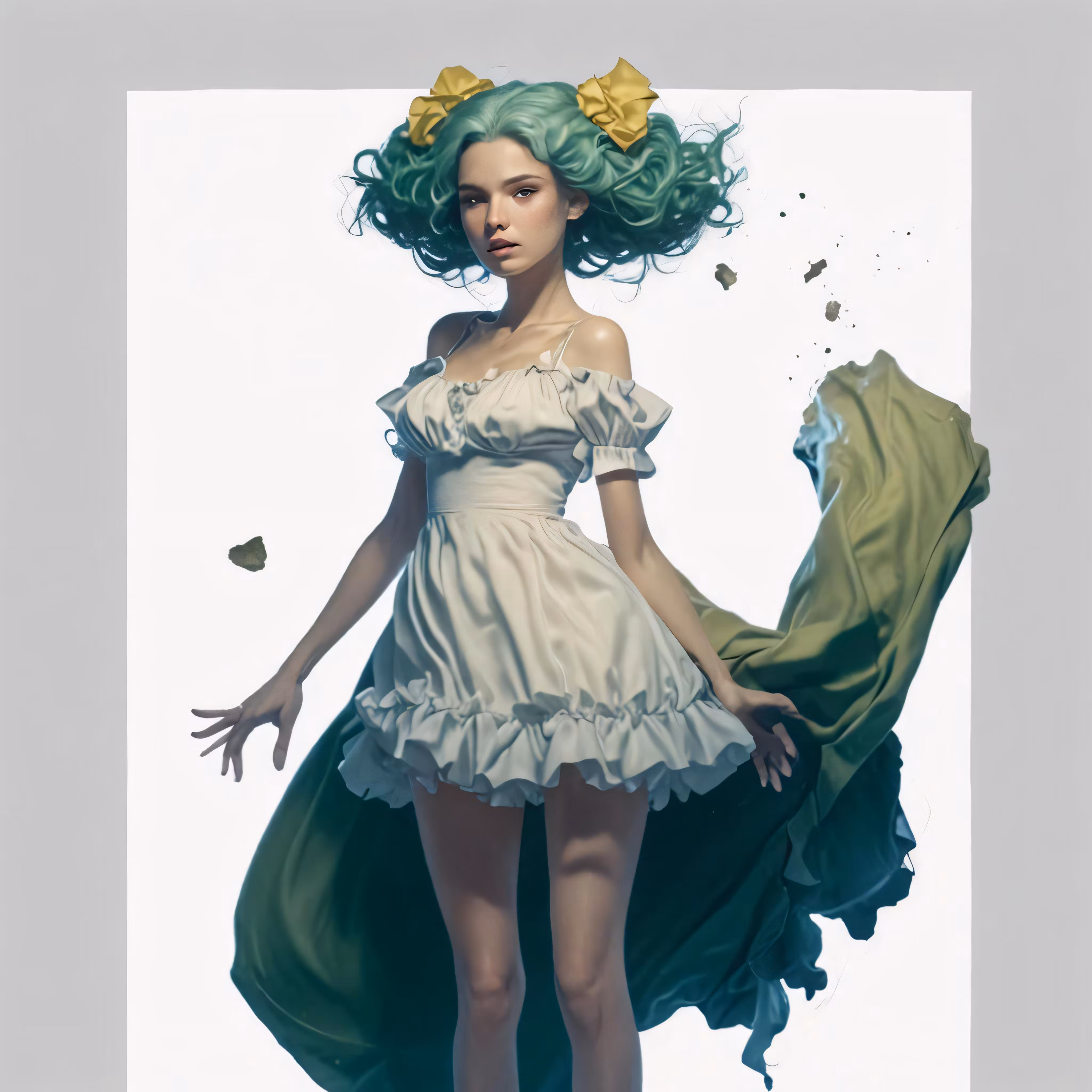 High resolution picture, free to use, a young woman with green hair wearing a short dress