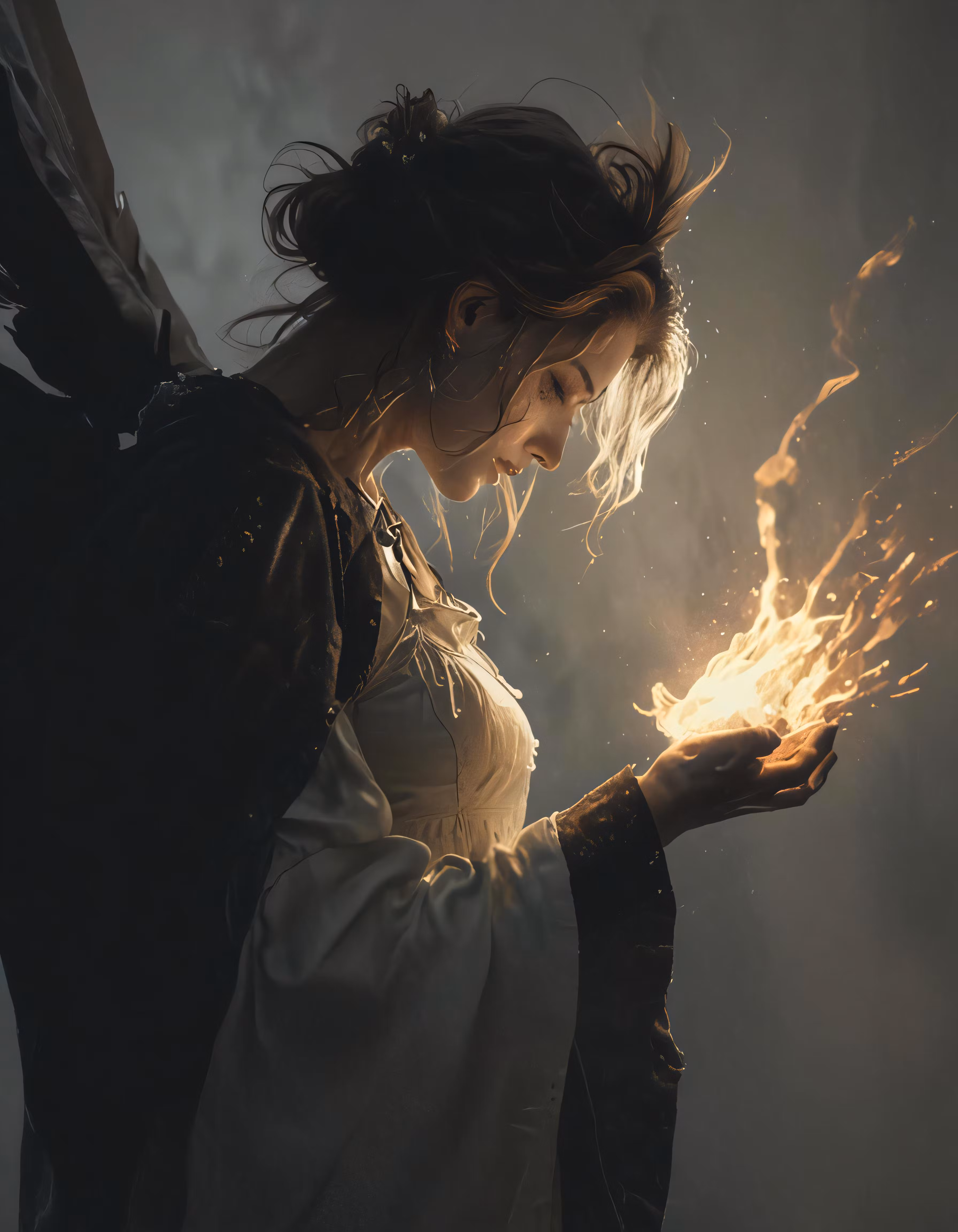 High resolution picture, free to use, a young woman with long hair, dressed in period dress and holding onto the arms of her hands with fire