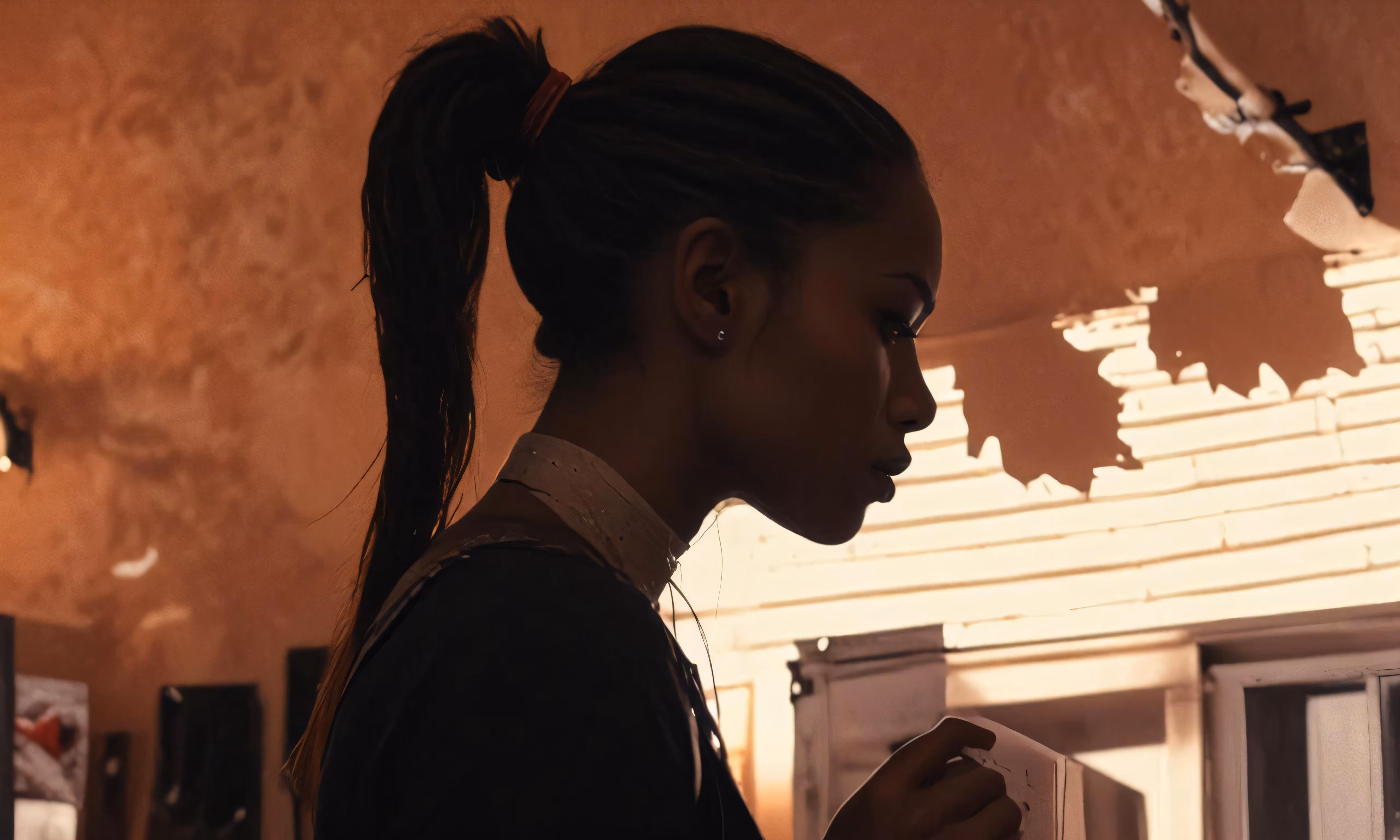 High resolution picture, free to use, a young woman with long ponytail standing in front of an unfinished ceiling