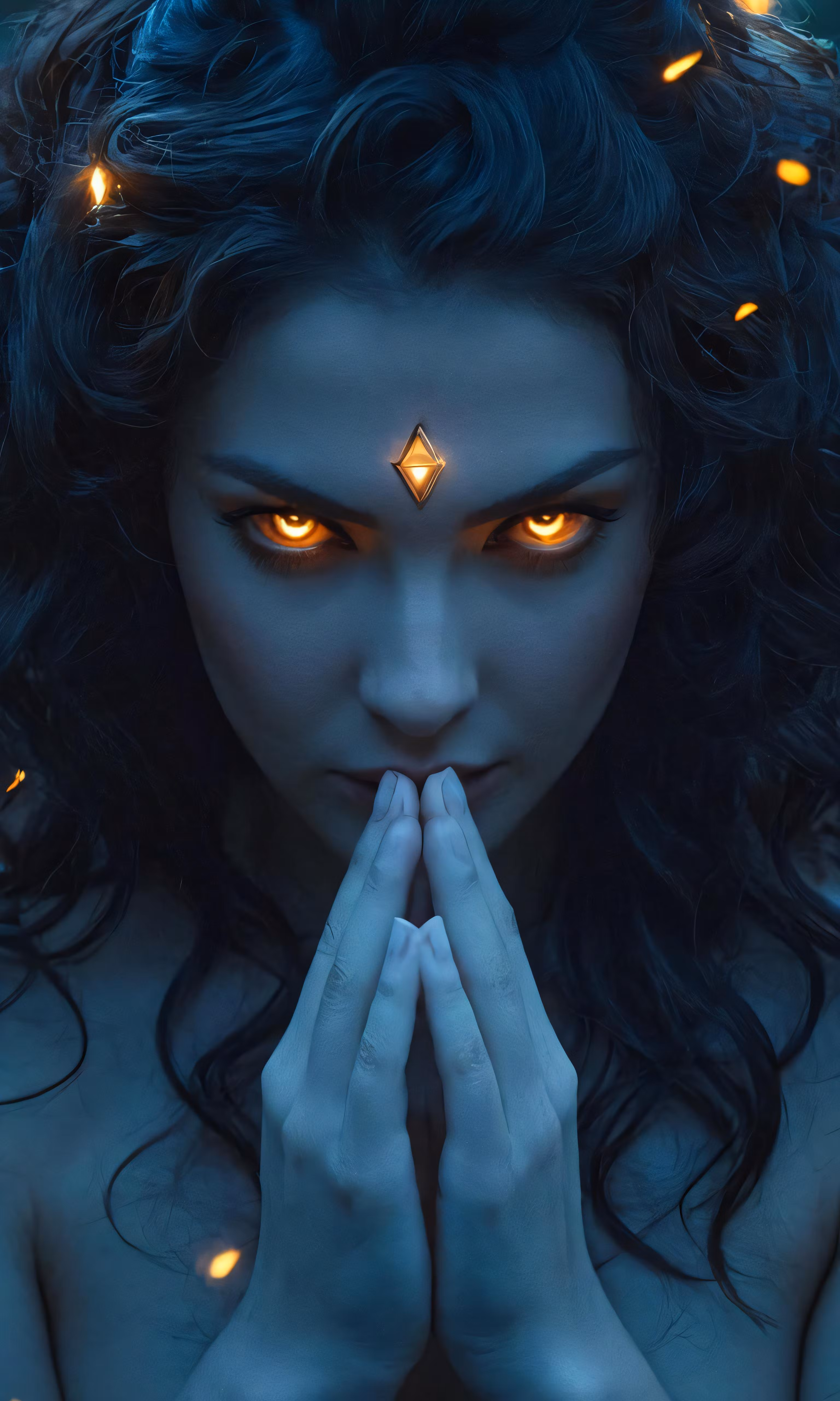 High resolution picture, free to use, a young woman with orange eyes and glowing eyebrows