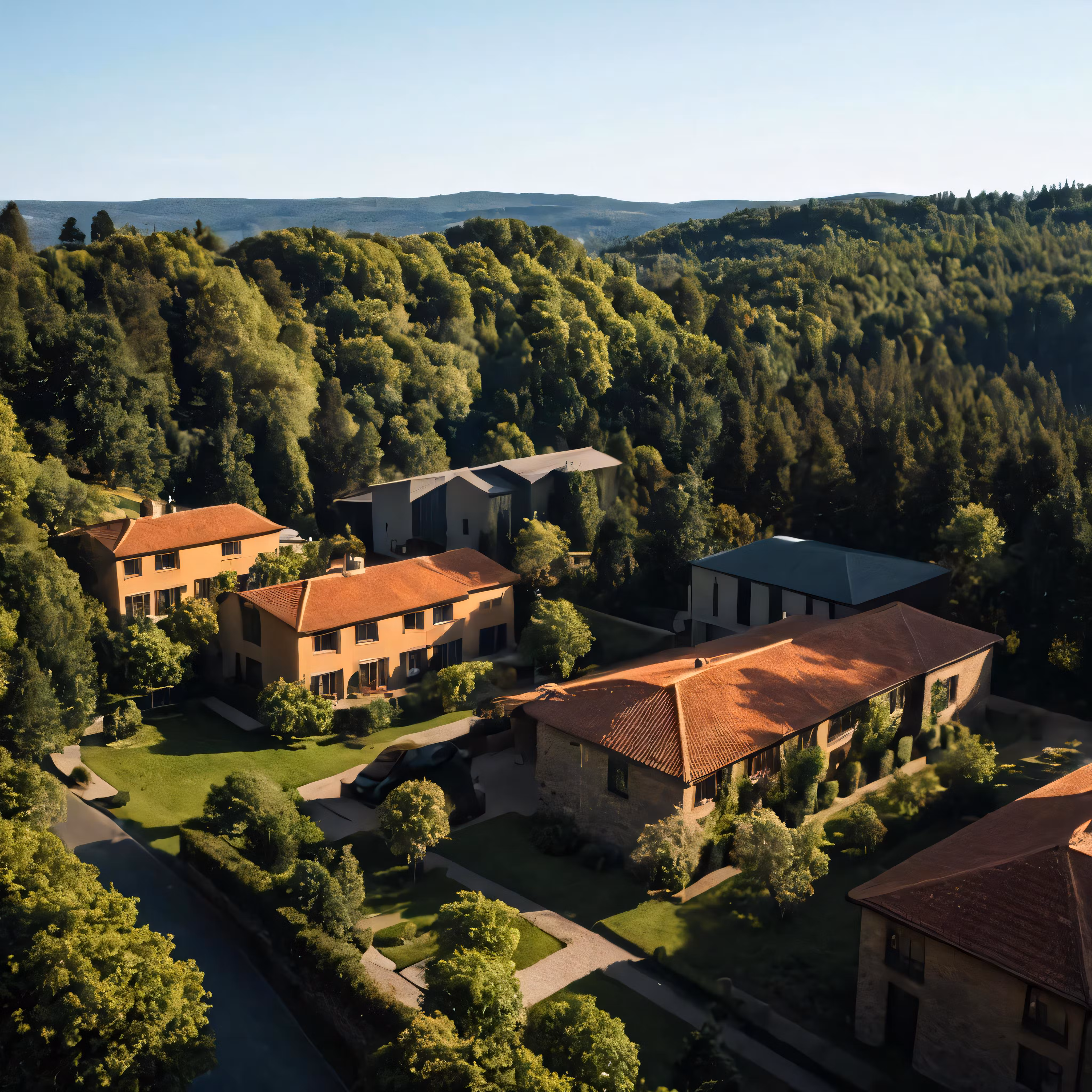 High resolution picture, free to use, aerial view of several building complex surrounded by trees
