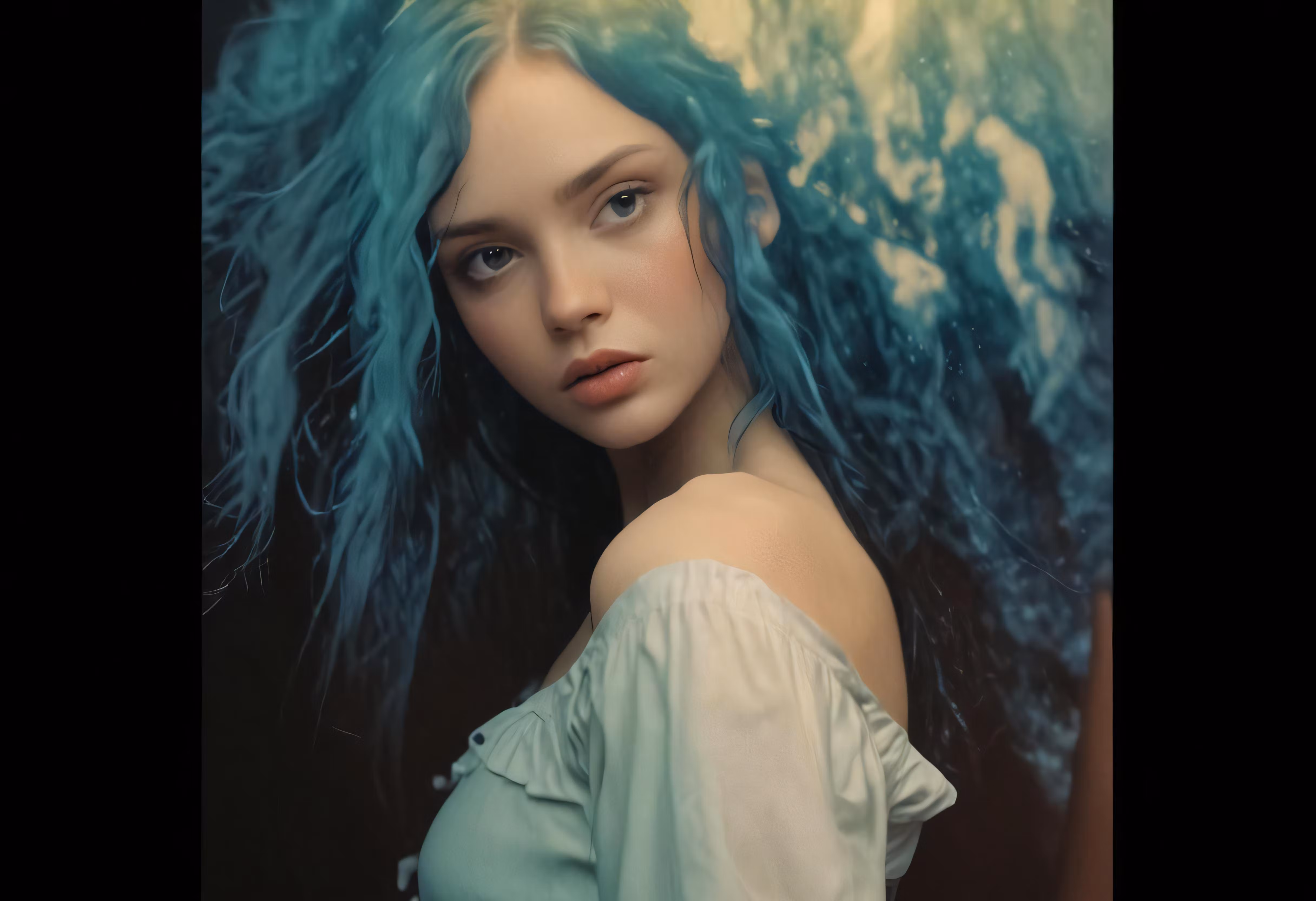 High resolution picture, free to use, an 3d artwork photo of a woman with blue hair