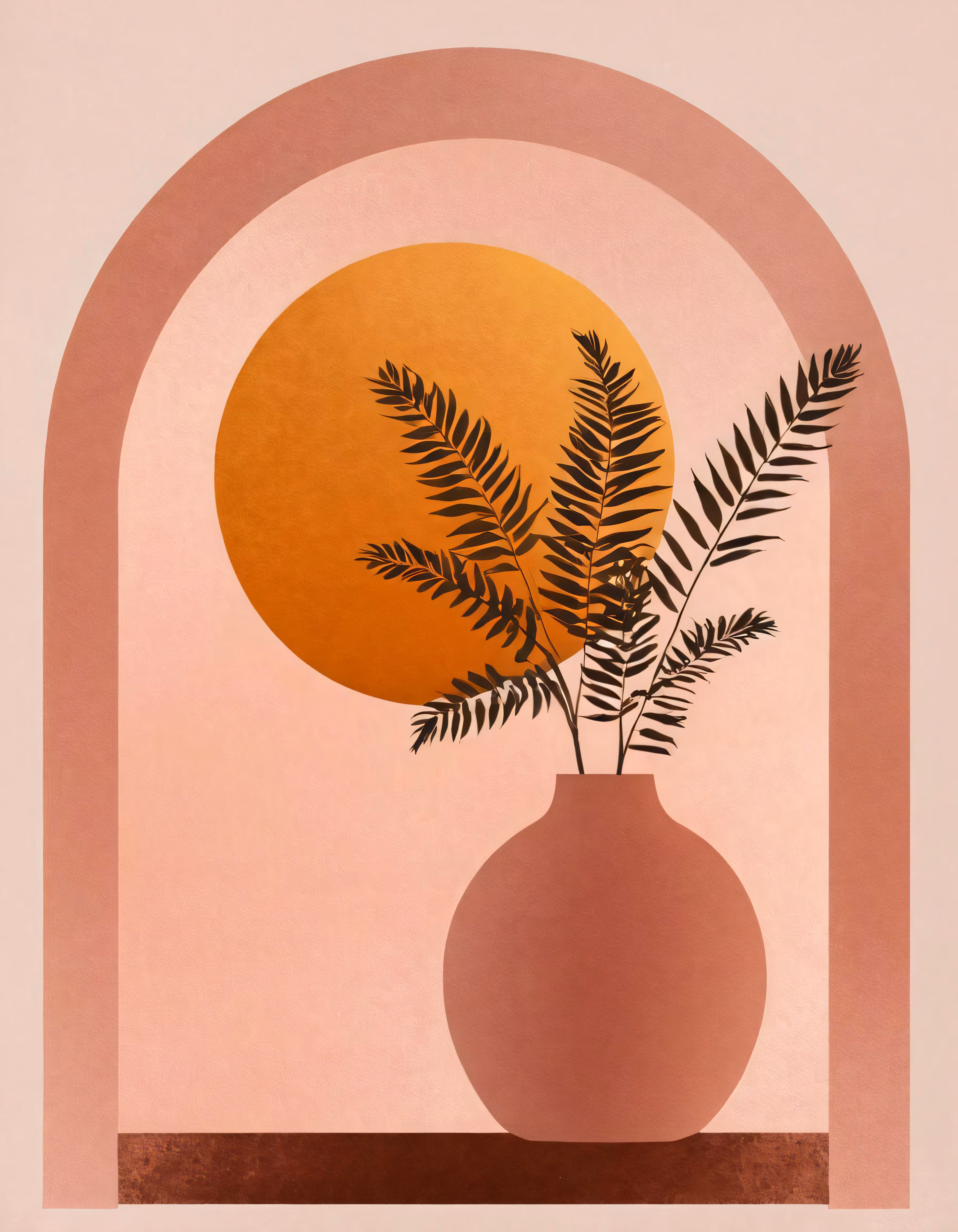 High resolution picture, free to use, an abstract graphic of a vase with leaves on the table