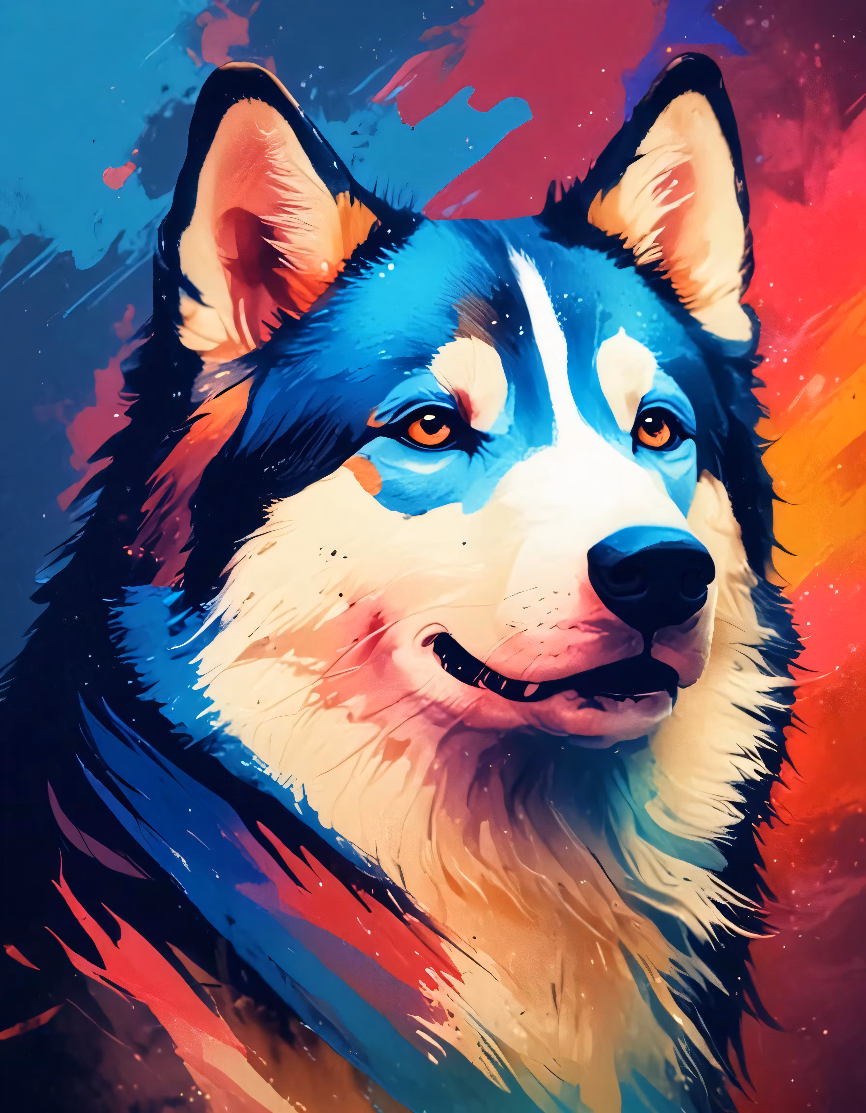 High resolution picture, free to use, an abstract painting of a husky dog with bright colors
