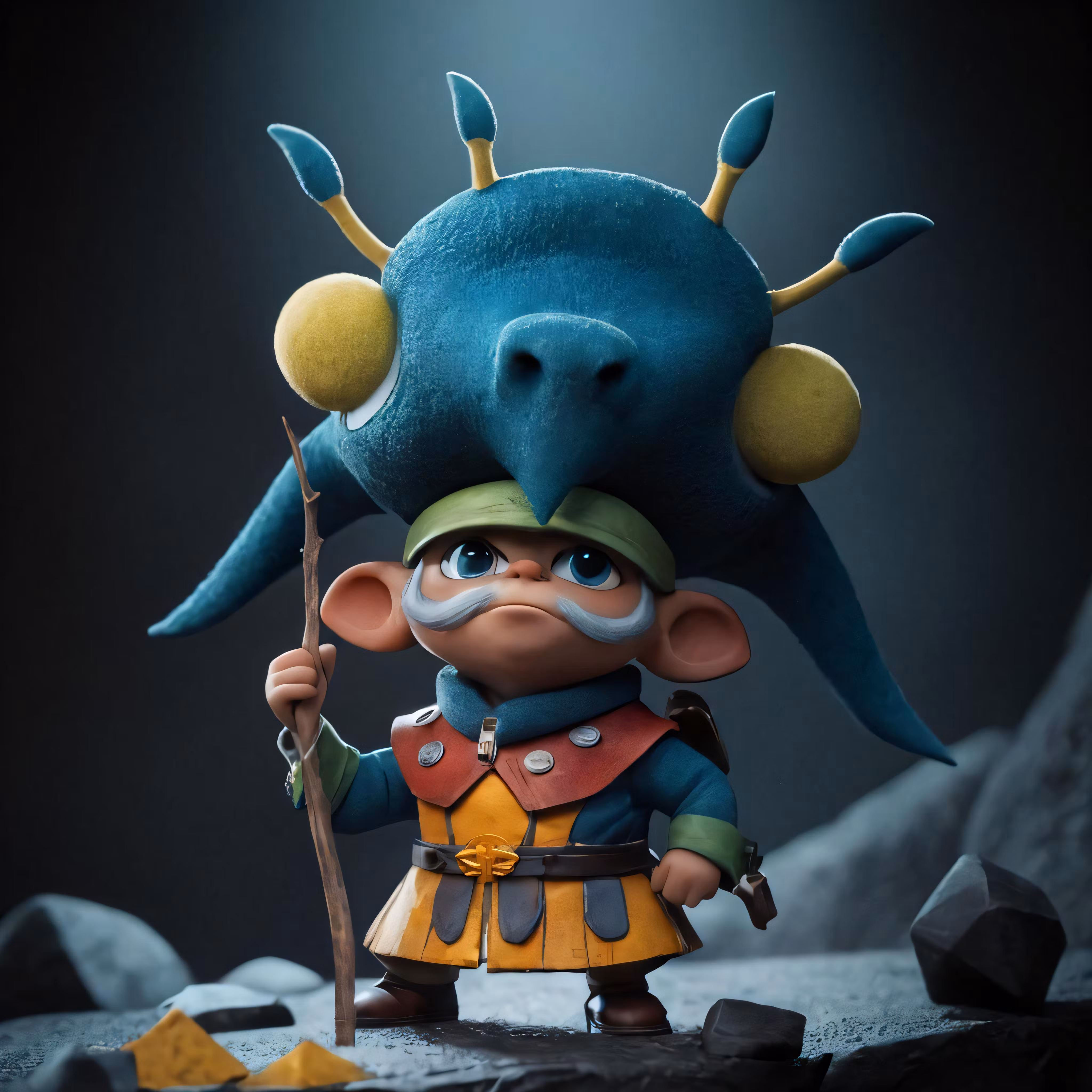 High resolution picture, free to use, an action figure holding a stick on a rocky ground