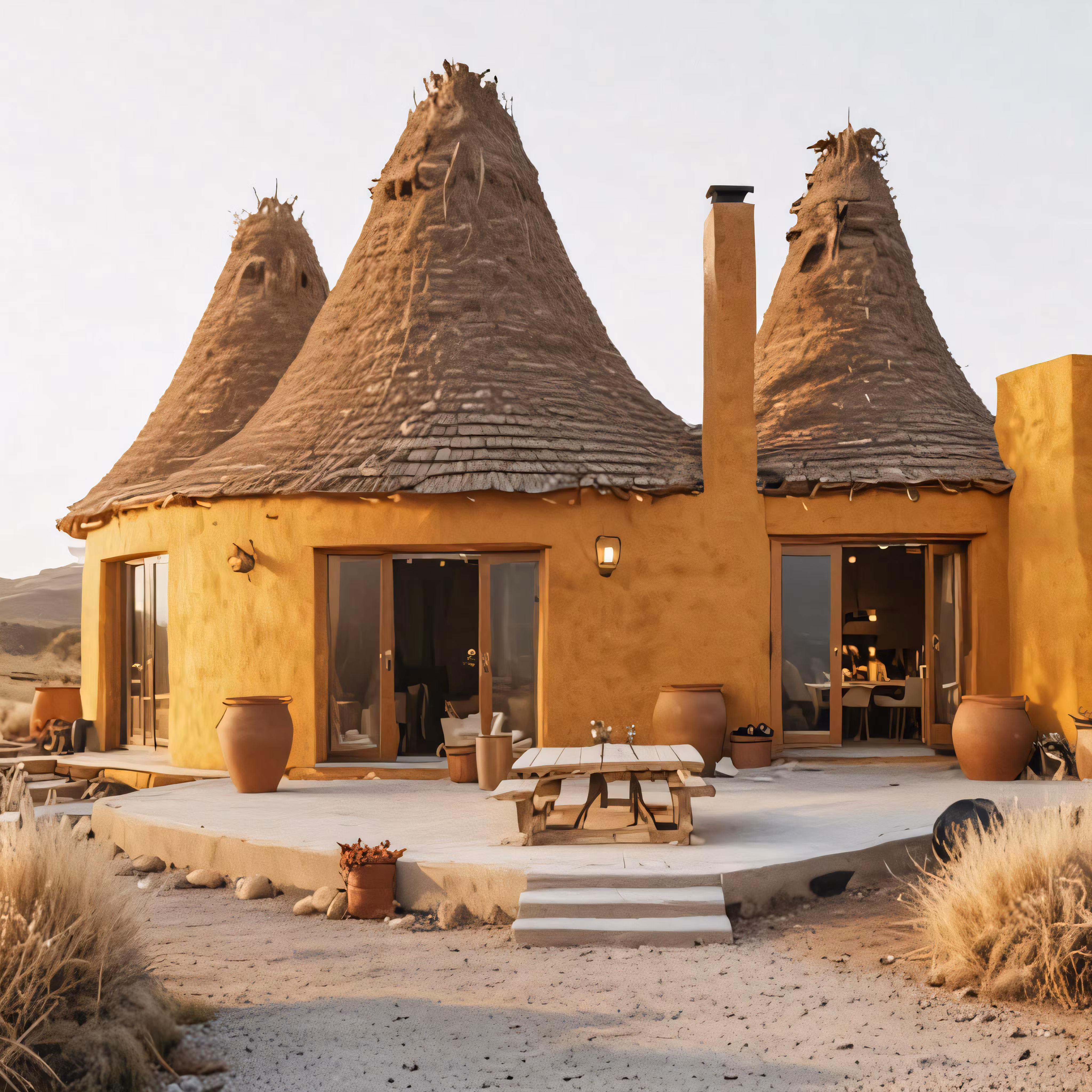 High resolution picture, free to use, an adobe house with thatched roof and benches