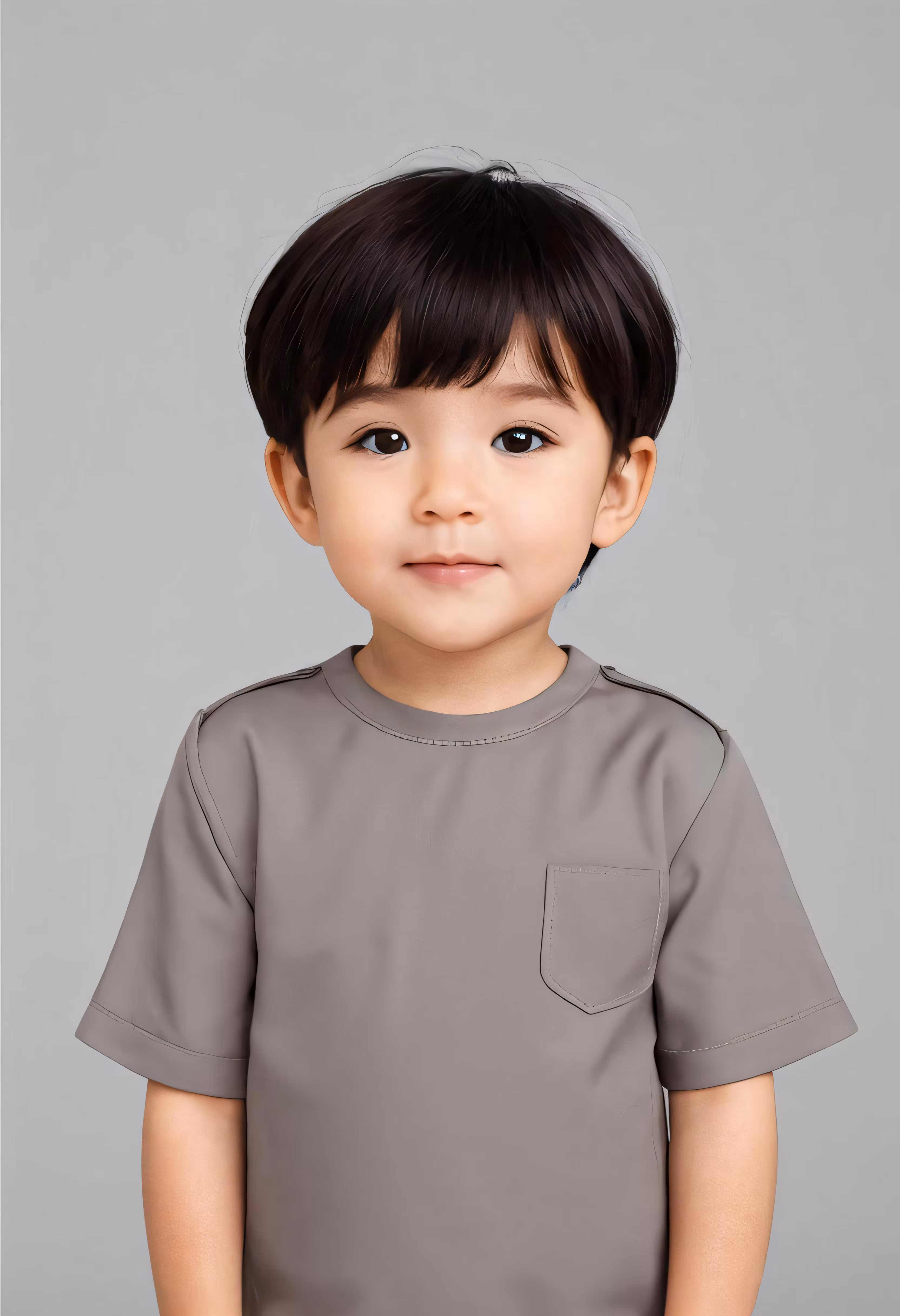 High resolution picture, free to use, an adorable asian boy with a short black hair is wearing a gray t   shirt