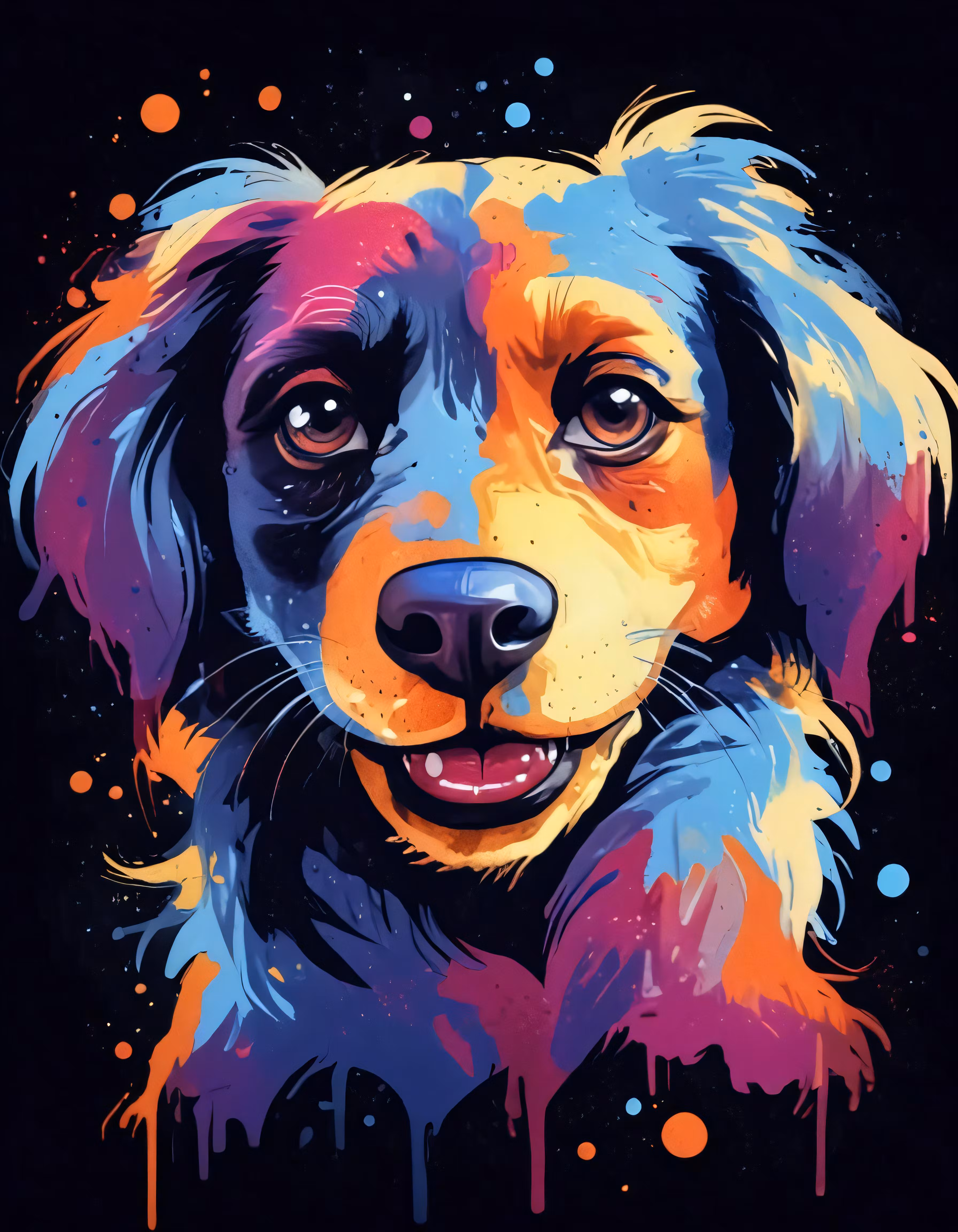 High resolution picture, free to use, an adorable black and tan dog with colorful paint splatches on it