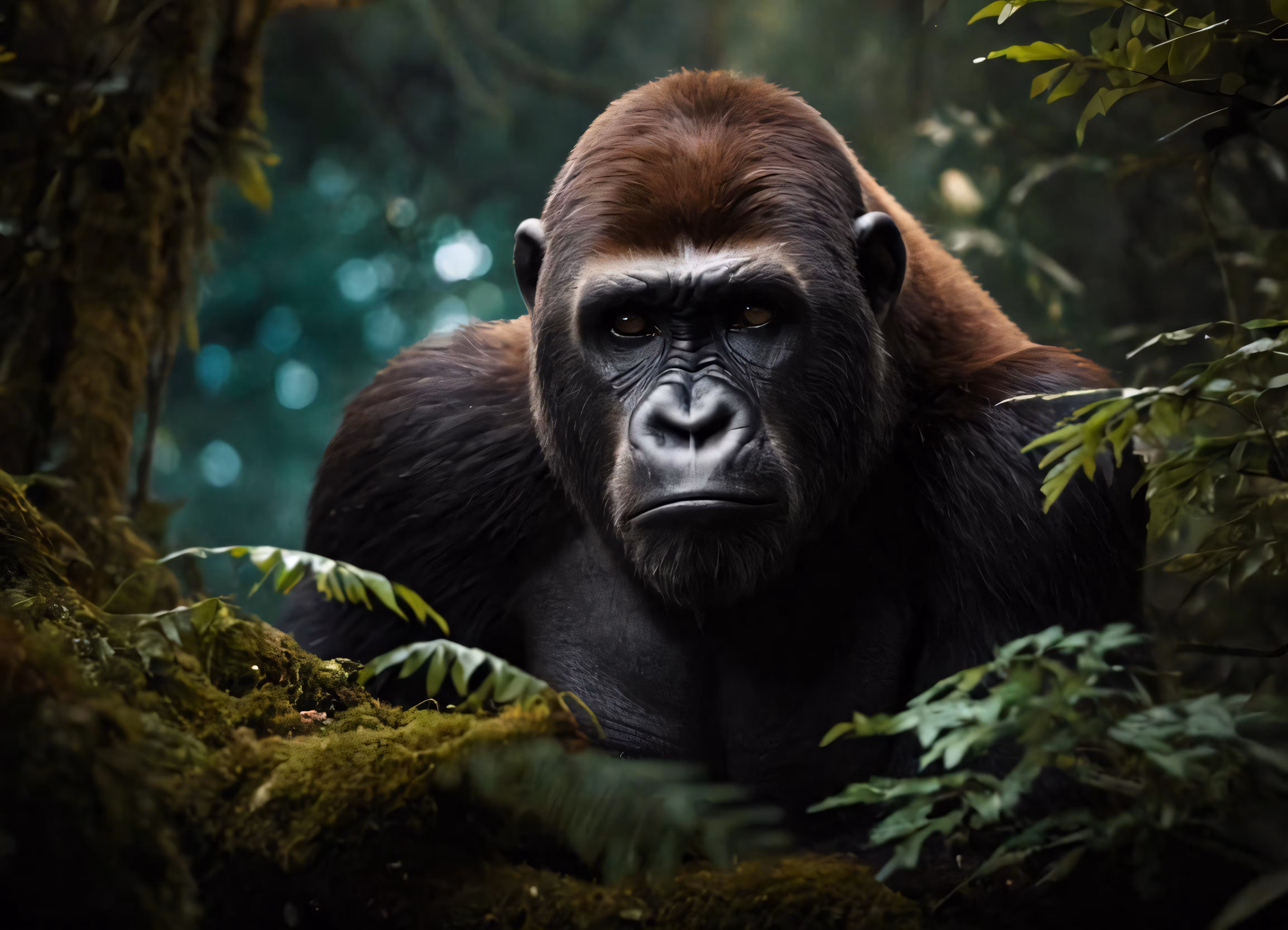 High resolution picture, free to use, an adult gorilla is in the forest with lots of plants