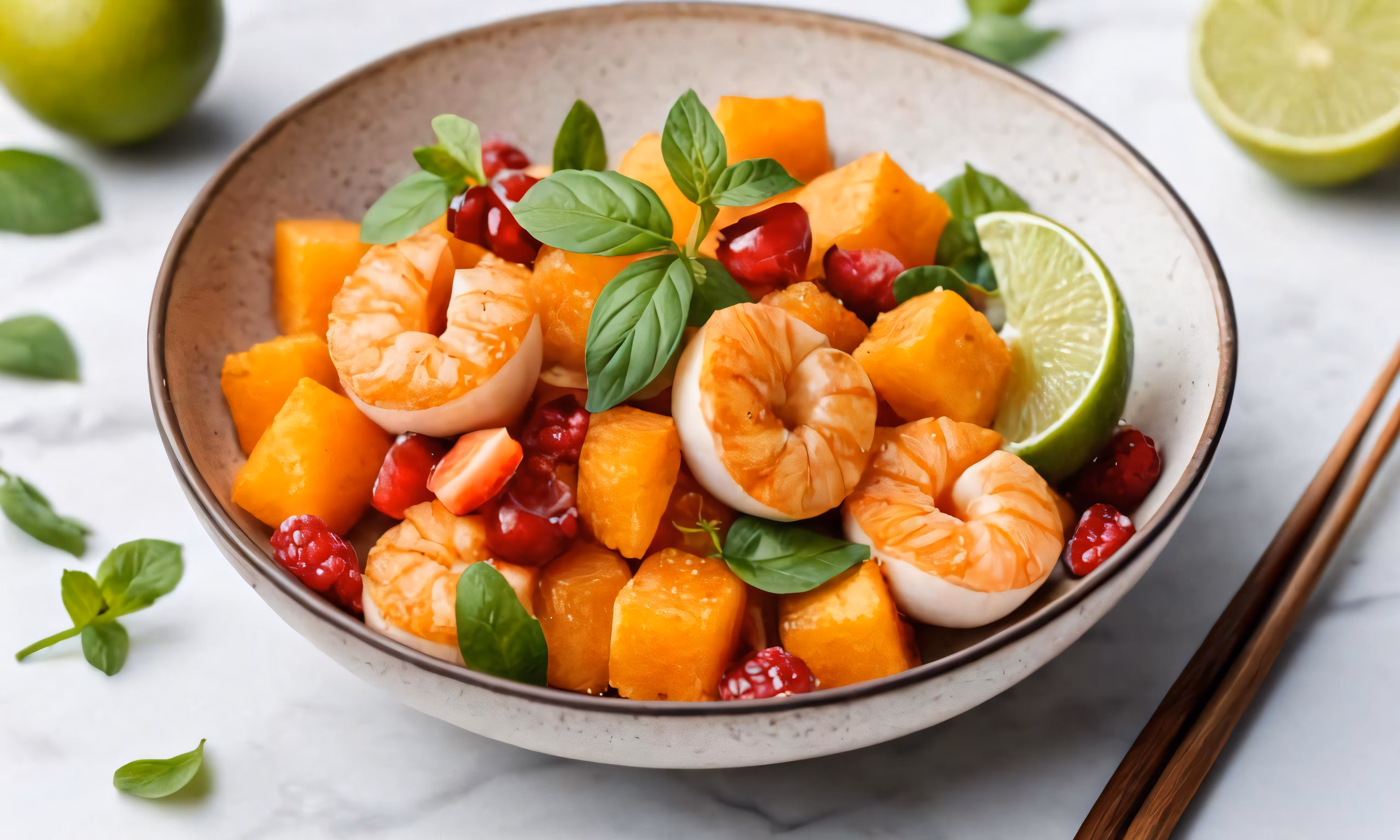 High resolution picture, free to use, an advertisement for a bicycle shop and it says 30 /a bowl of fruit salad with shrimp and veggies