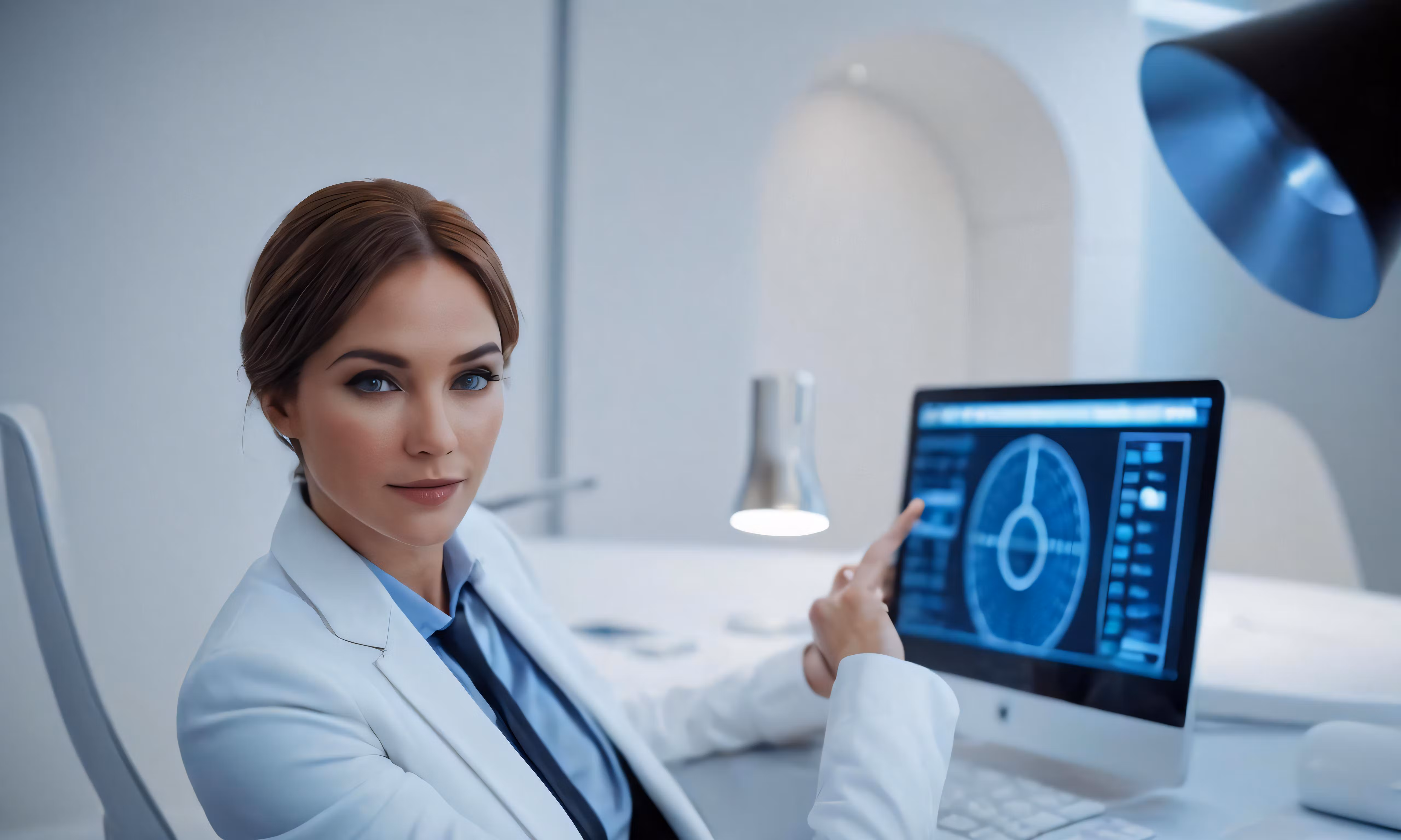 High resolution picture, free to use, an advertisement for a bicycle shop and it says 30 /a business woman pointing at the x   ray image on her computer