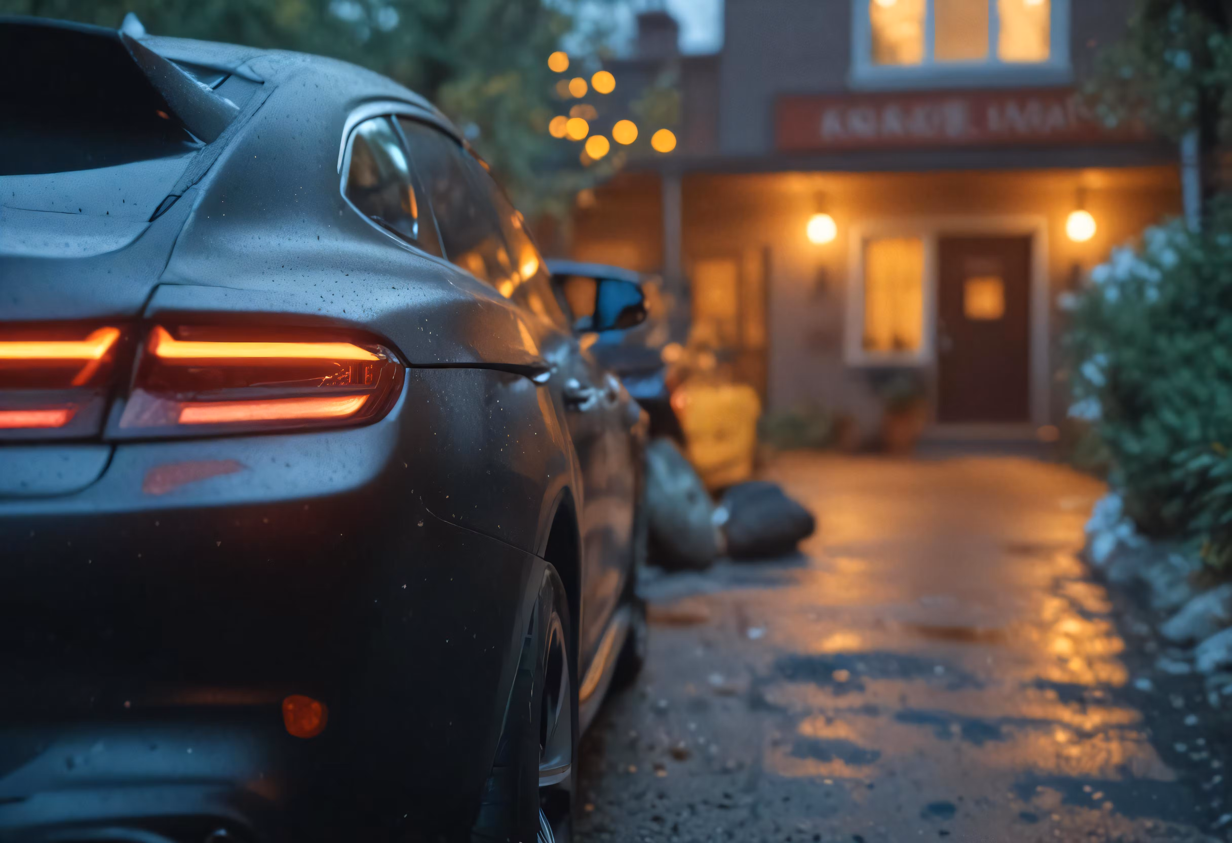 High resolution picture, free to use, an advertisement for a bicycle shop and it says 30 /a car parked on the street at night