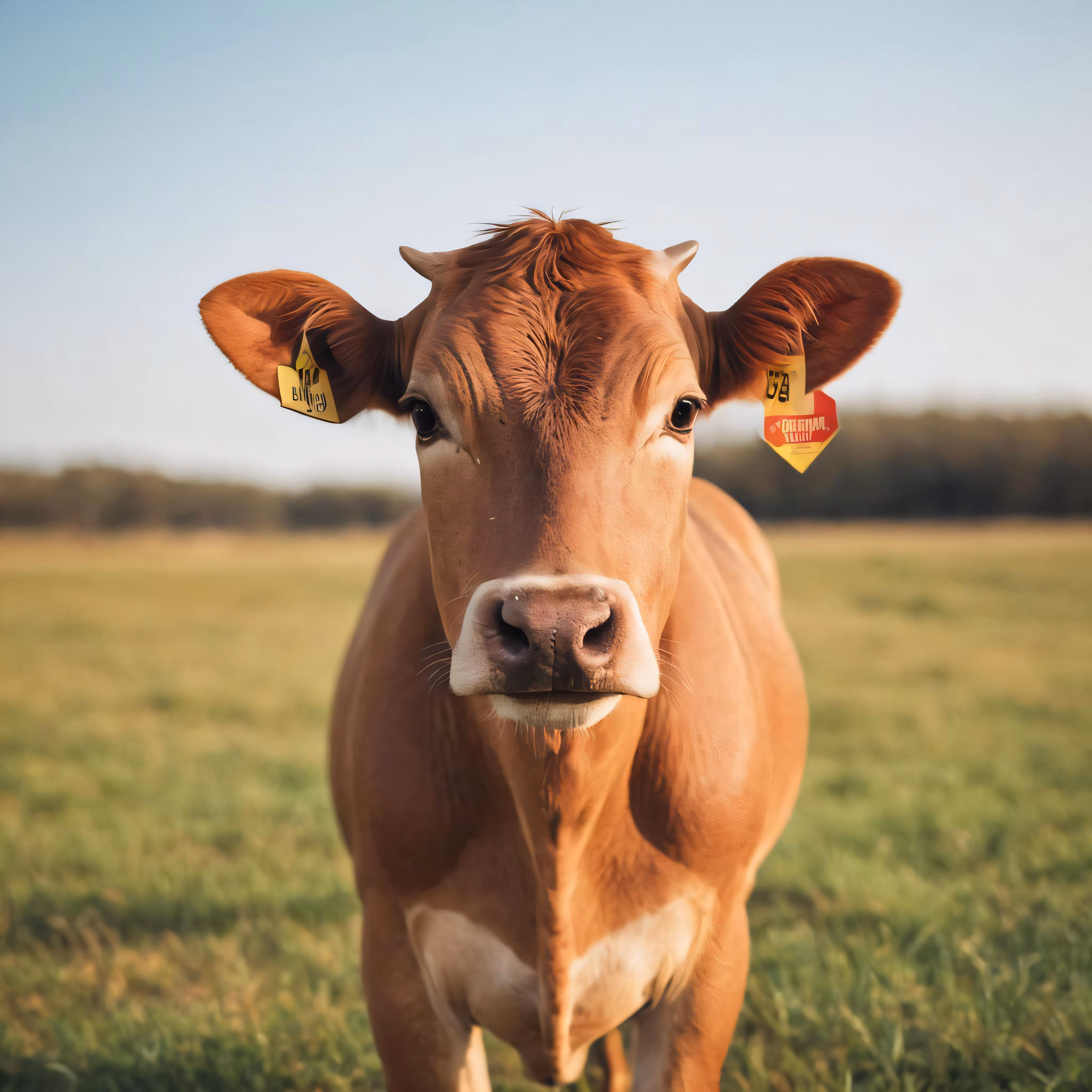 High resolution picture, free to use, an advertisement for a bicycle shop and it says 30 /a cow that has ears clipped back stands in a field