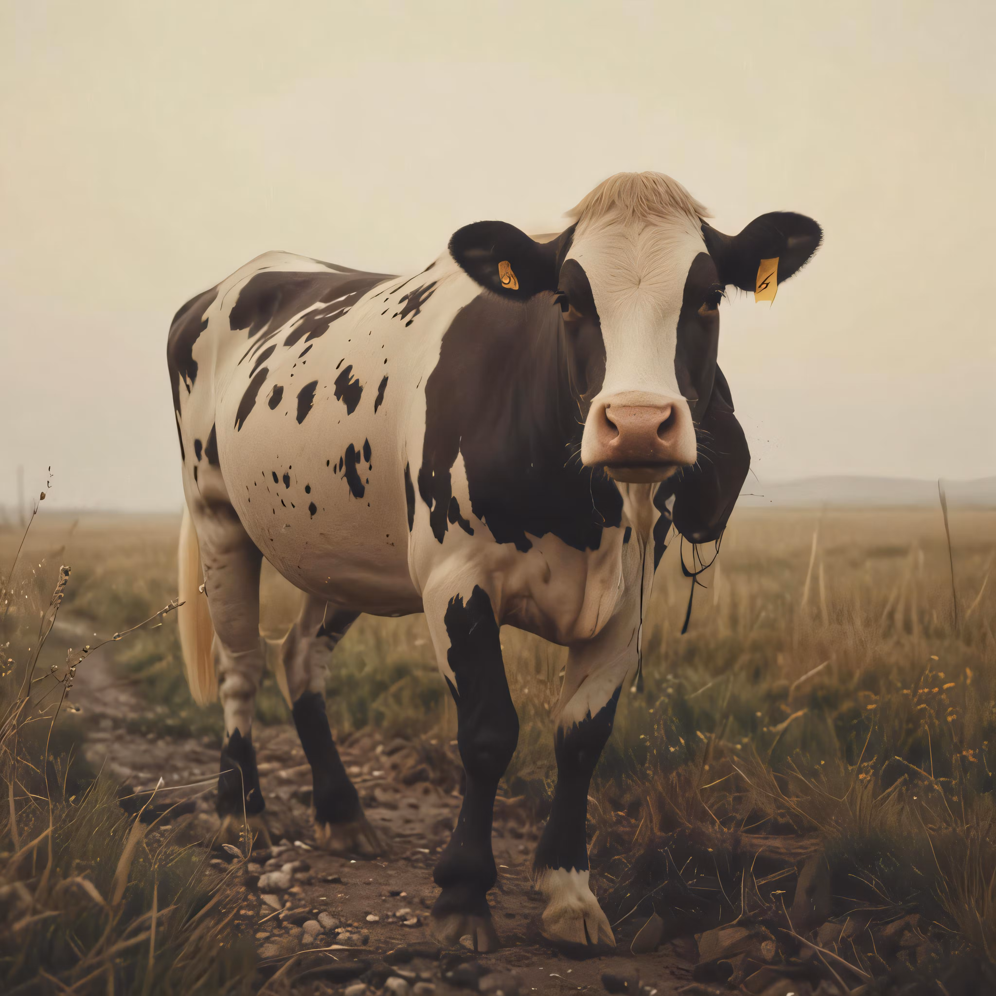 High resolution picture, free to use, an advertisement for a bicycle shop and it says 30 /a cow with black and white spots standing on a dirt road