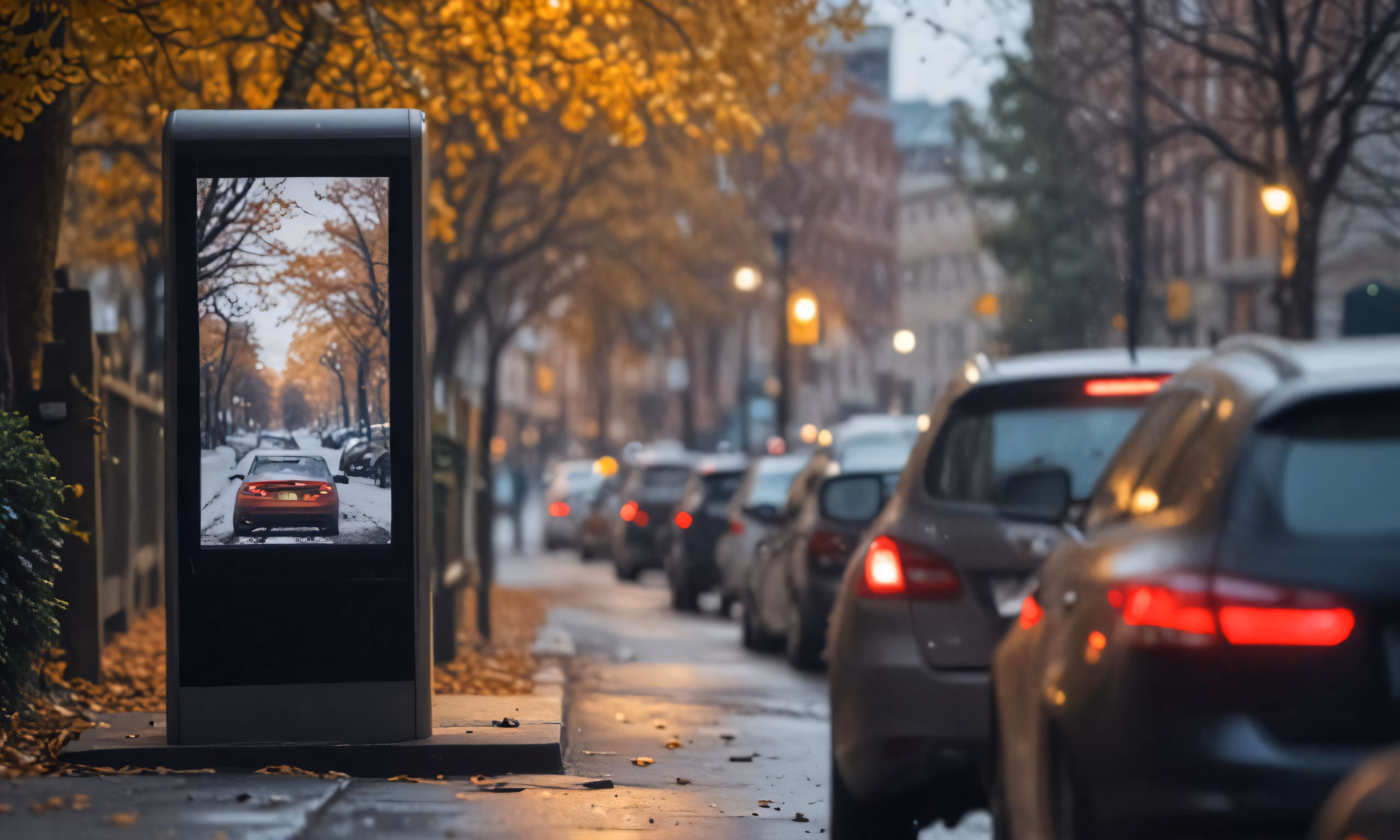 High resolution picture, free to use, an advertisement for a bicycle shop and it says 30 /a few cars stopped at the street curb