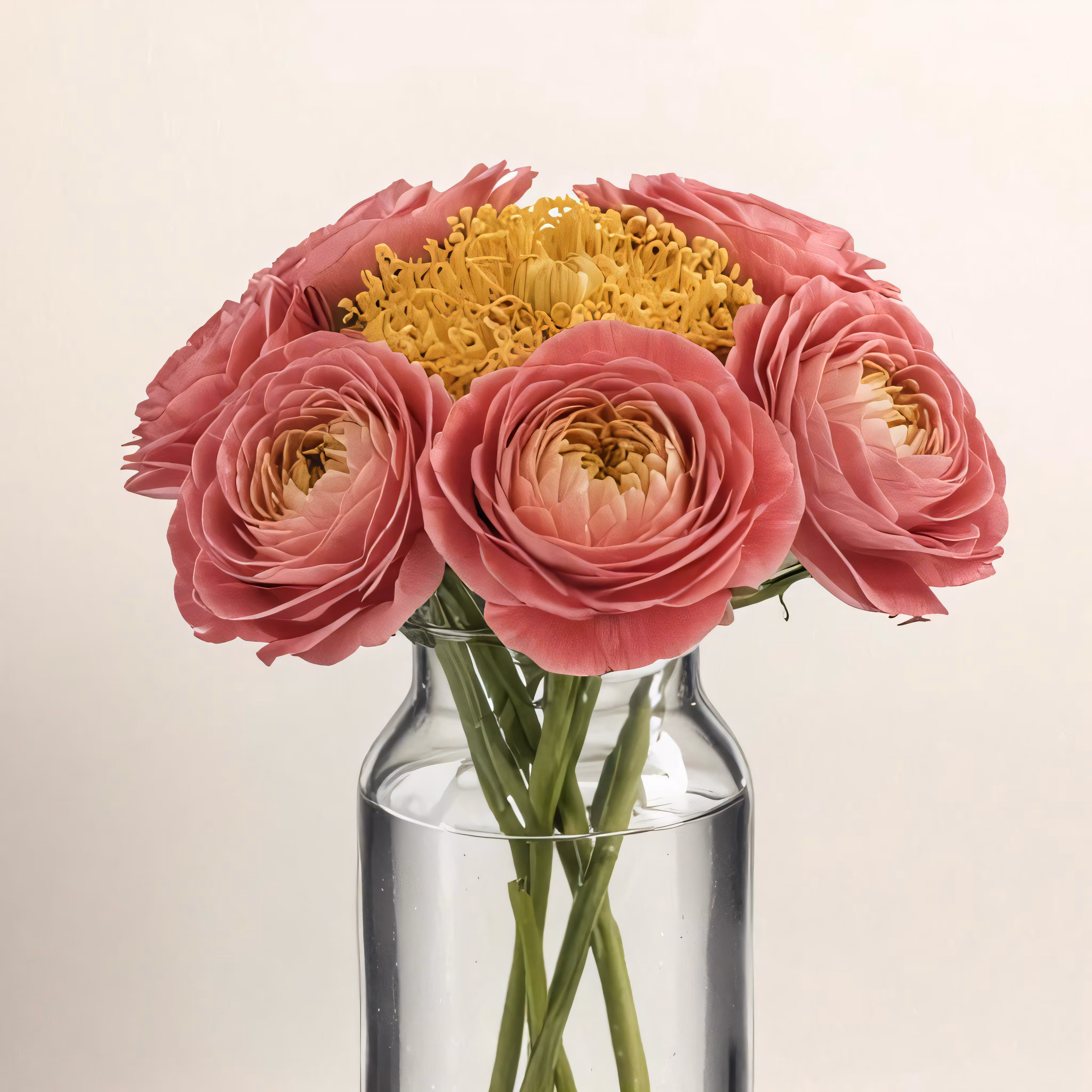 High resolution picture, free to use, an advertisement for a bicycle shop and it says 30 /a glass vase with four pink flowers in it