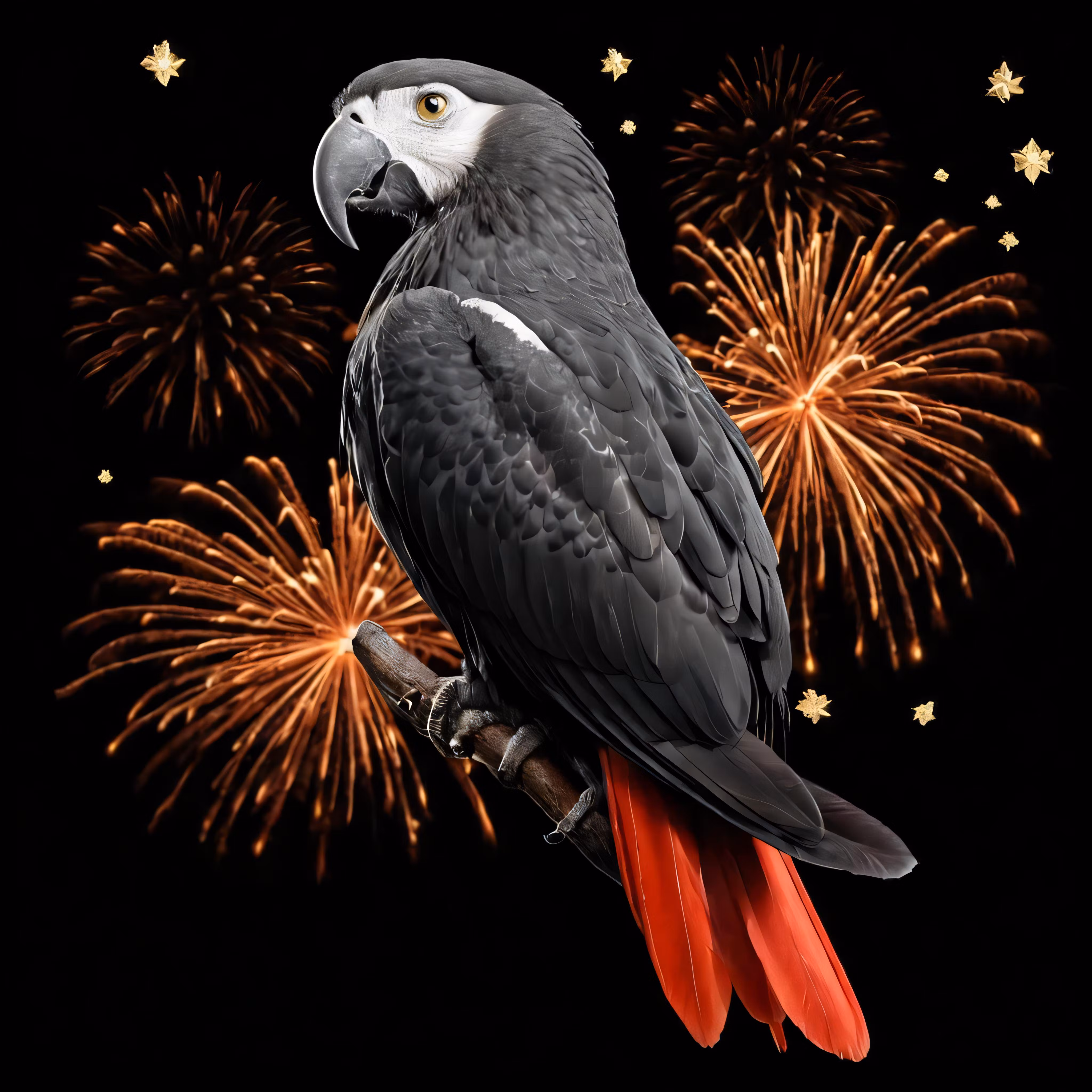 High resolution picture, free to use, an advertisement for a bicycle shop and it says 30 /a gray parrot sitting on a perch in front of fireworks
