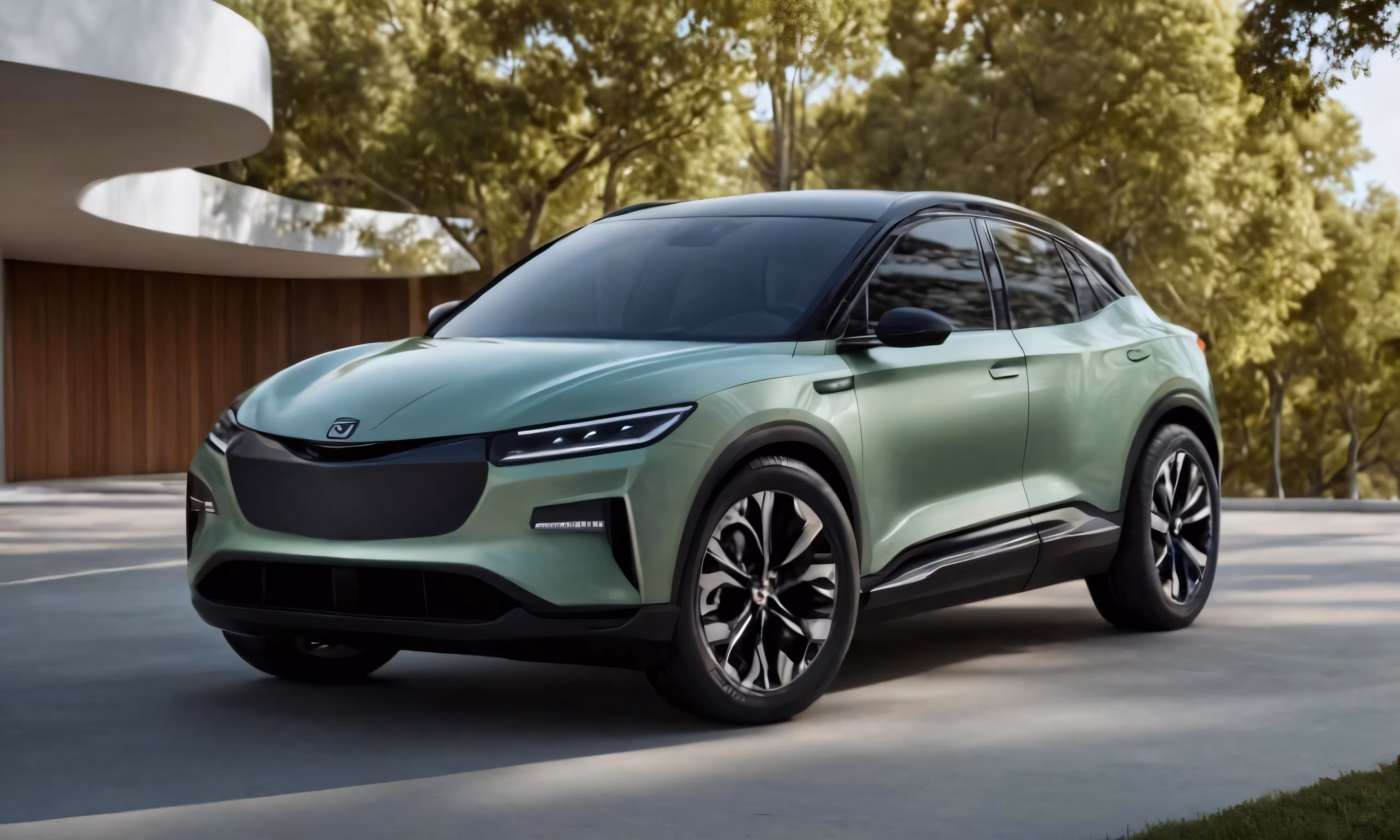 High resolution picture, free to use, an advertisement for a bicycle shop and it says 30 /a green electric suv parked on the street