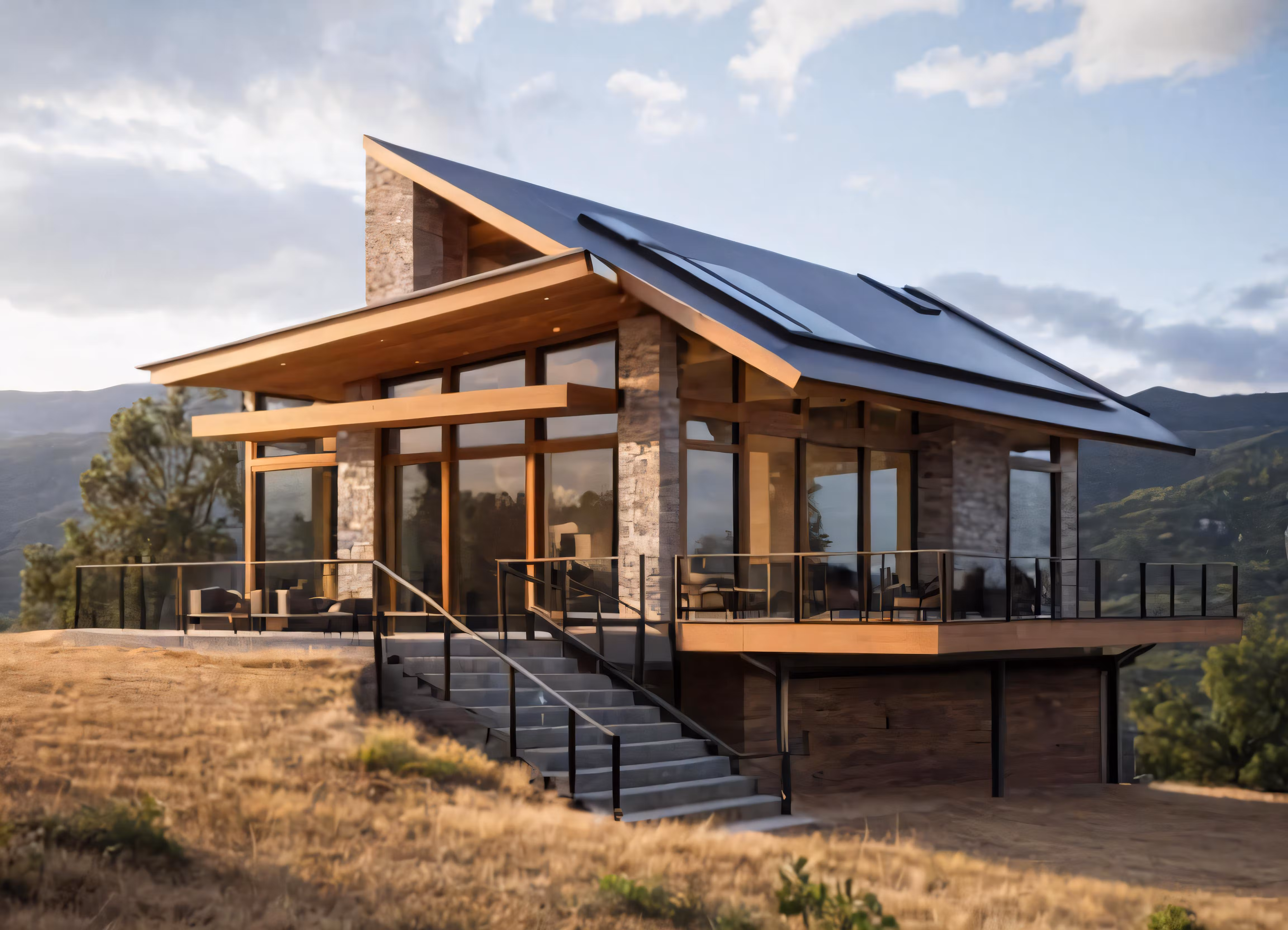 High resolution picture, free to use, an advertisement for a bicycle shop and it says 30 /a large home with a roof that has solar panels on the sides of it