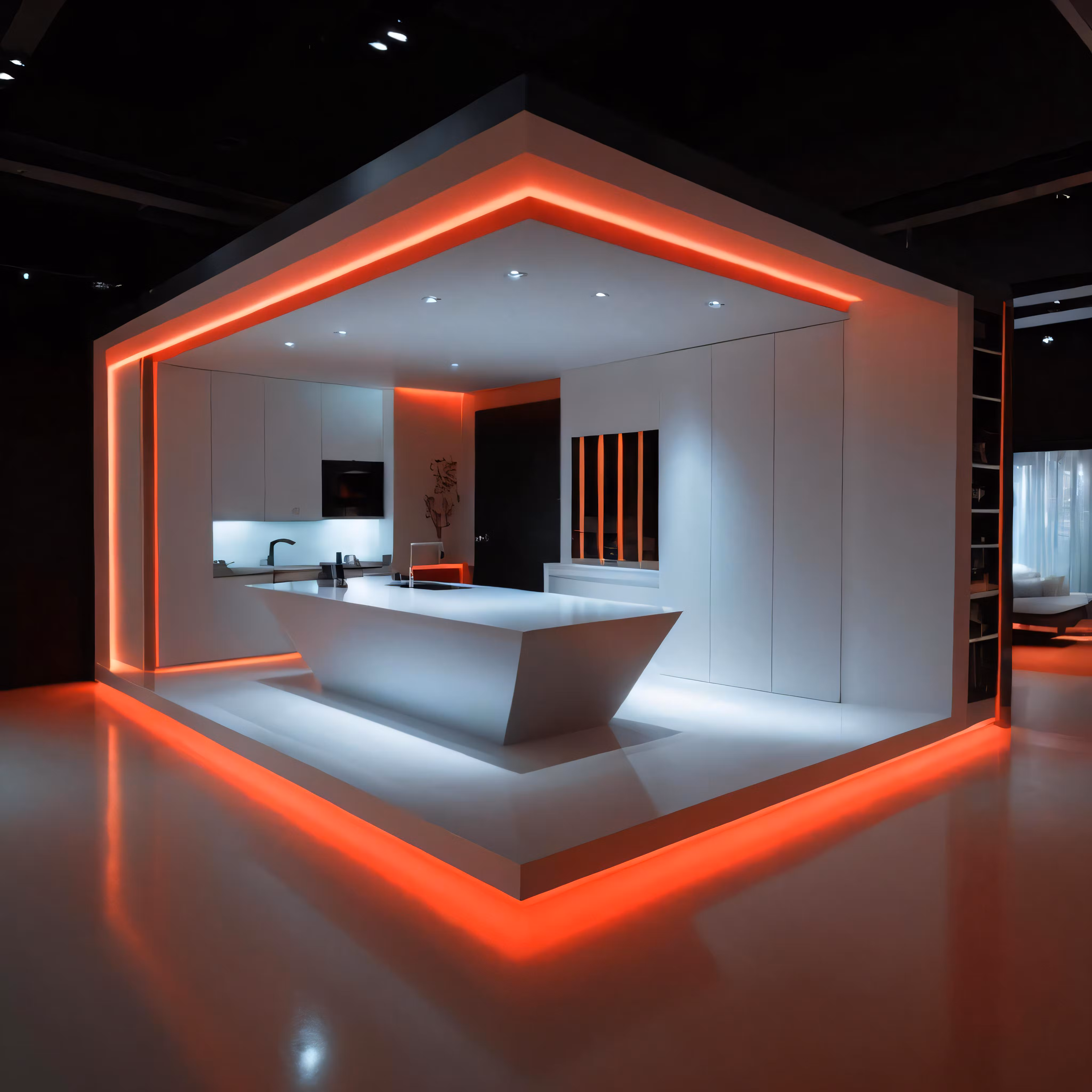 High resolution picture, free to use, an advertisement for a bicycle shop and it says 30 /a large room with bright colored lighting on the walls