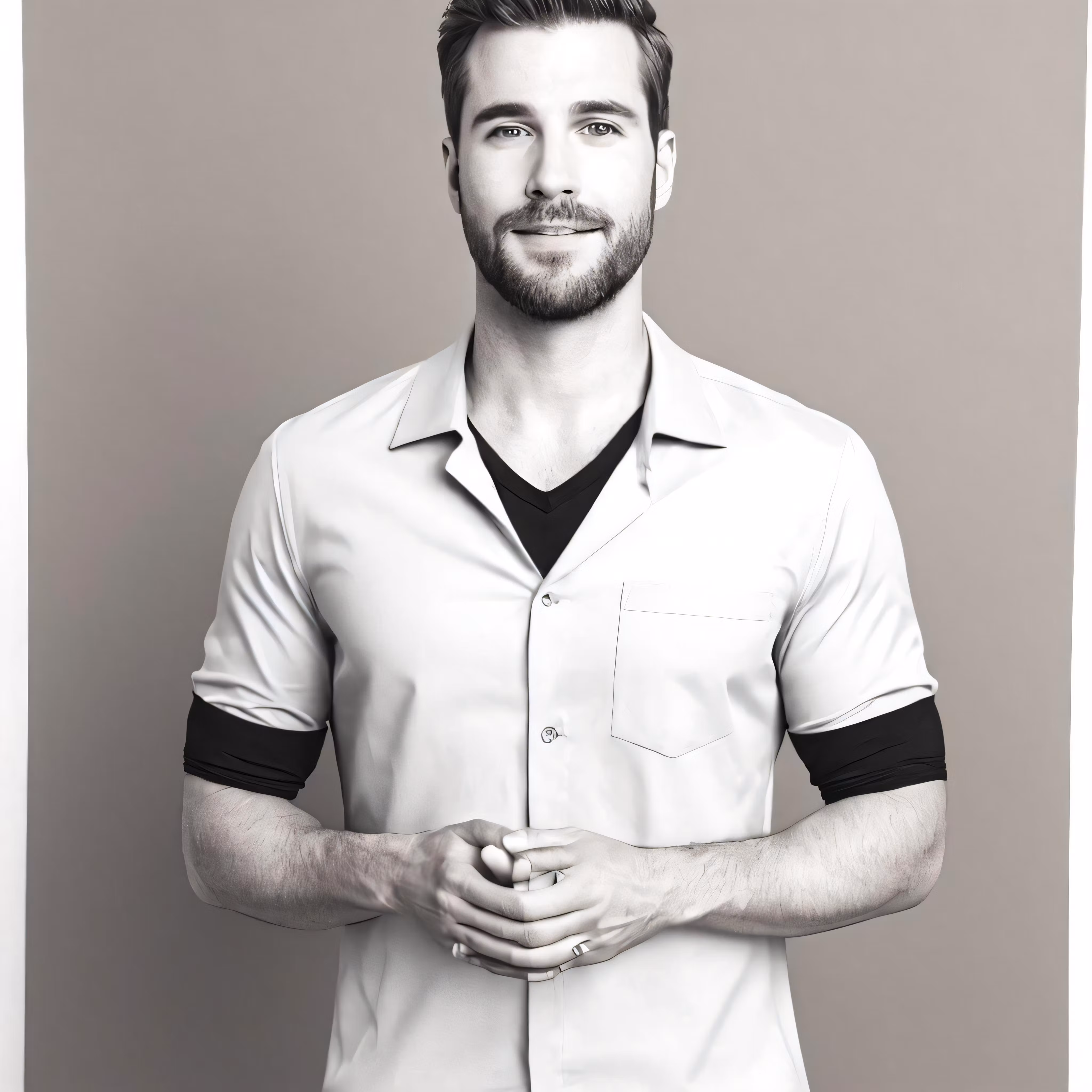 High resolution picture, free to use, an advertisement for a bicycle shop and it says 30 /a male model dressed in white with a black shirt