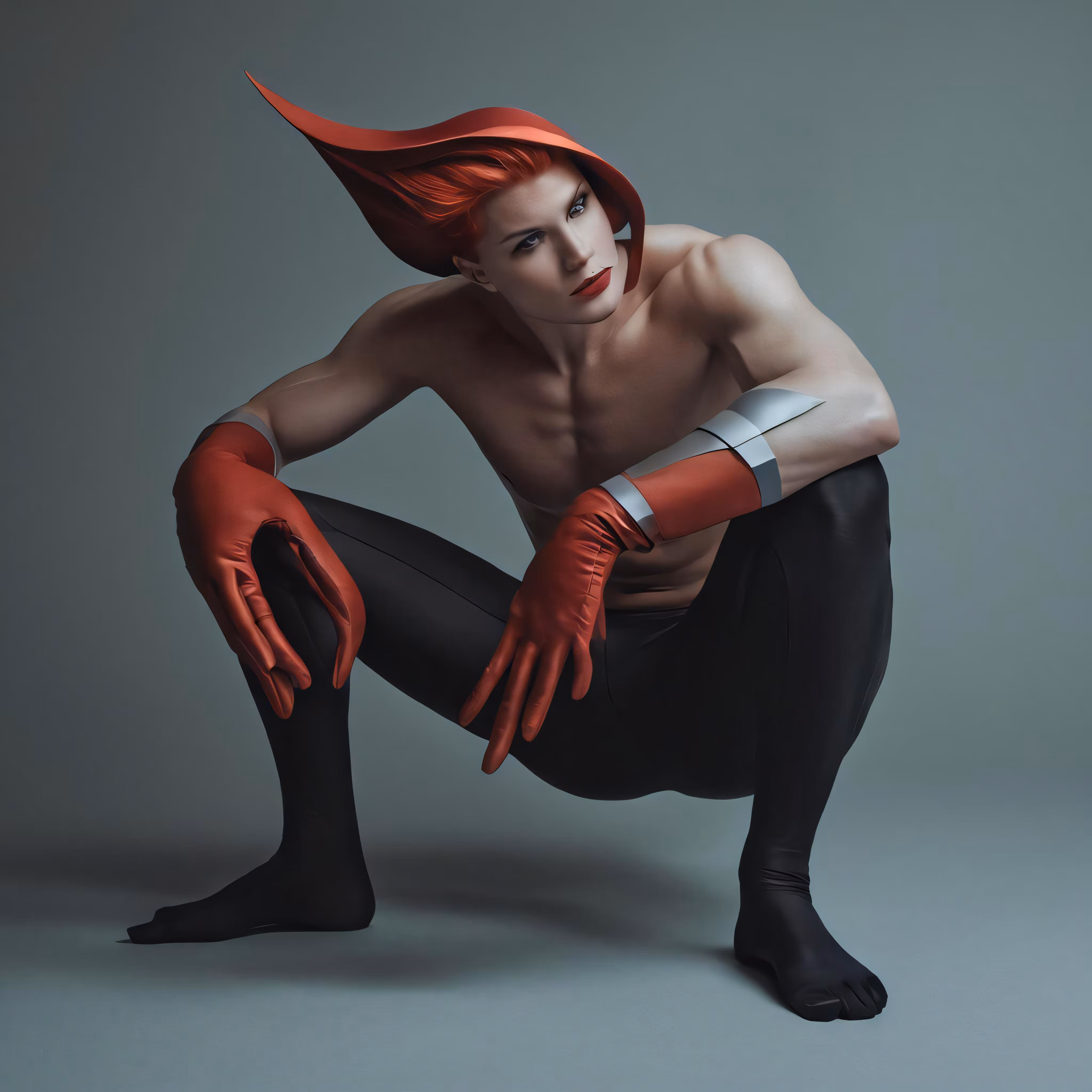 High resolution picture, free to use, an advertisement for a bicycle shop and it says 30 /a man in full makeup with red hair and gloves